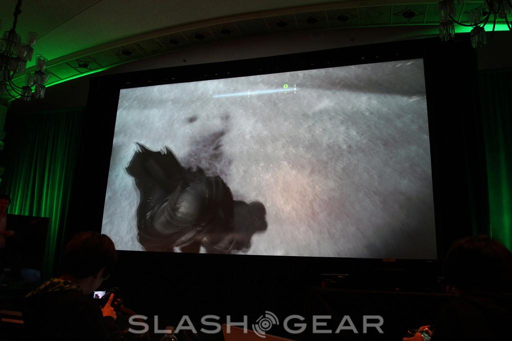 Outside the Batcave, Gotham City is ready to be explored in full. This map is twice the size of the open-world map of Arkham City. Here you'll find NVIDIA's optimization taking full effect. One example of how realistic NVIDIA's optimizations made this game, Mattes showed off the dynamic snow system in a simple demonstration – walking around Gotham City on Christmas Eve.