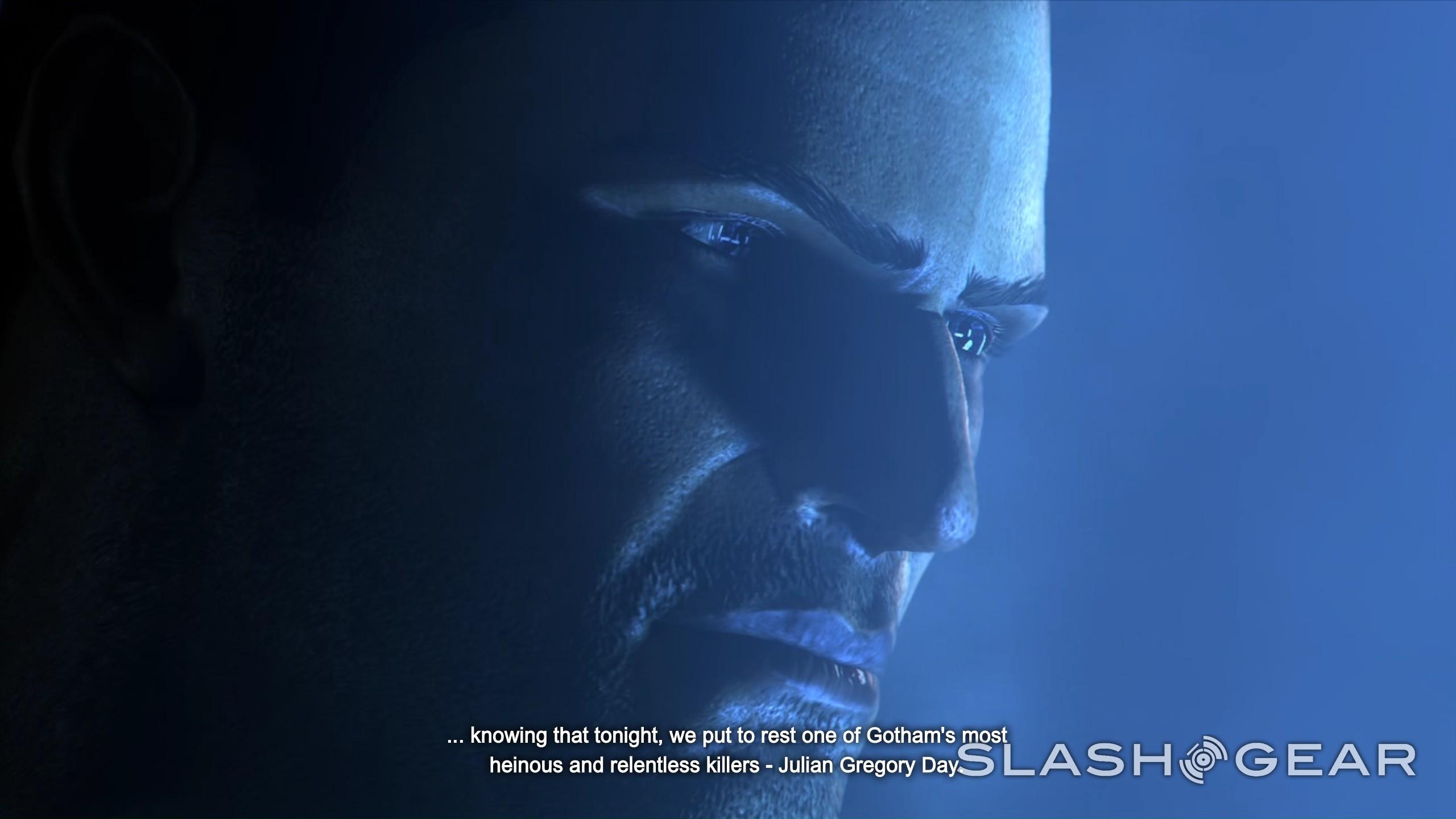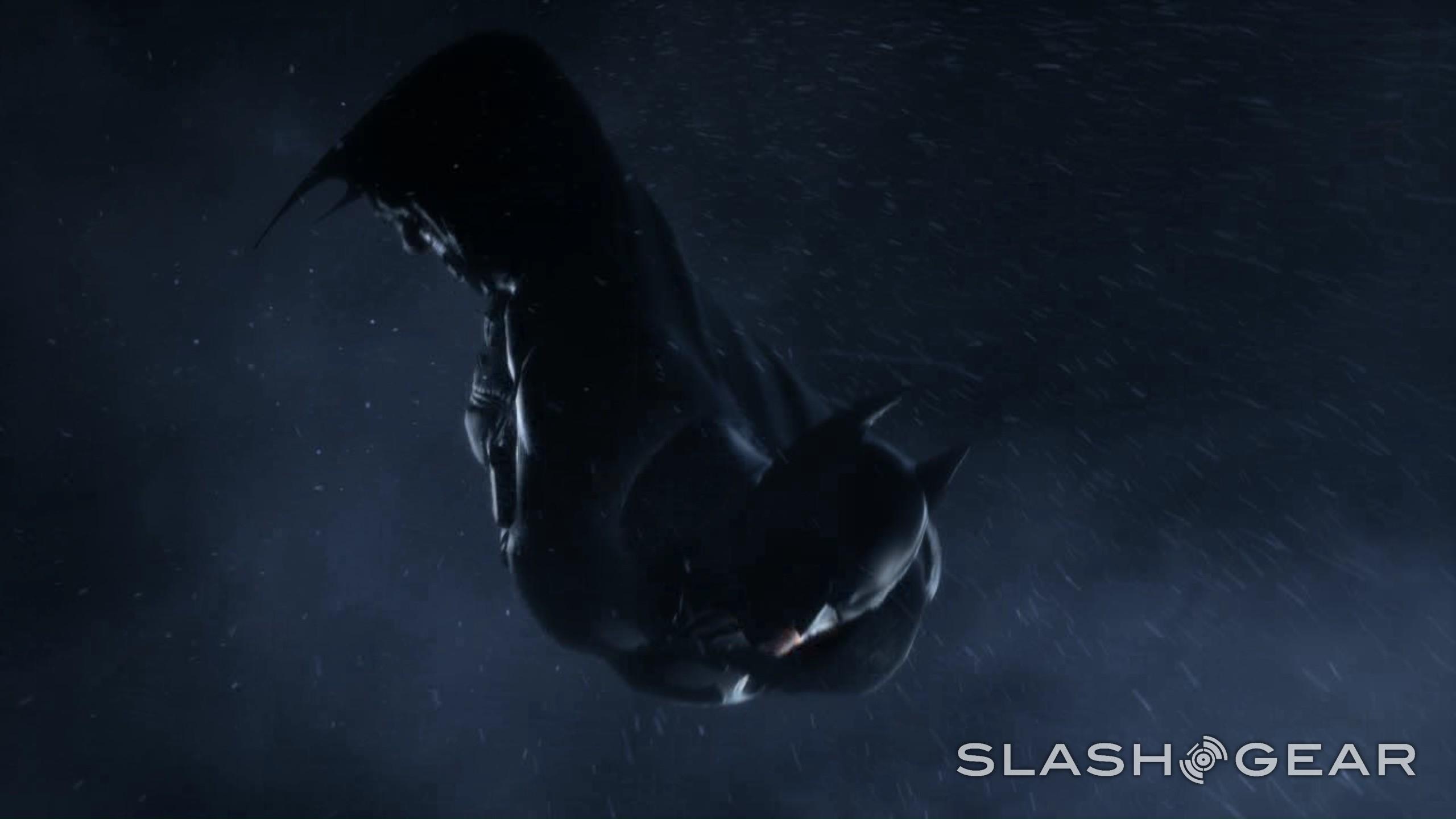 "Outside the Batcave, Gotham City is ready to be explored in full. This map is twice the size of the open-world map of Arkham City. Here you'll find NVIDIA's optimization taking full effect. One example of how realistic NVIDIA's optimizations made this game, Mattes showed off the dynamic snow system in a simple demonstration – walking around Gotham City on Christmas Eve.