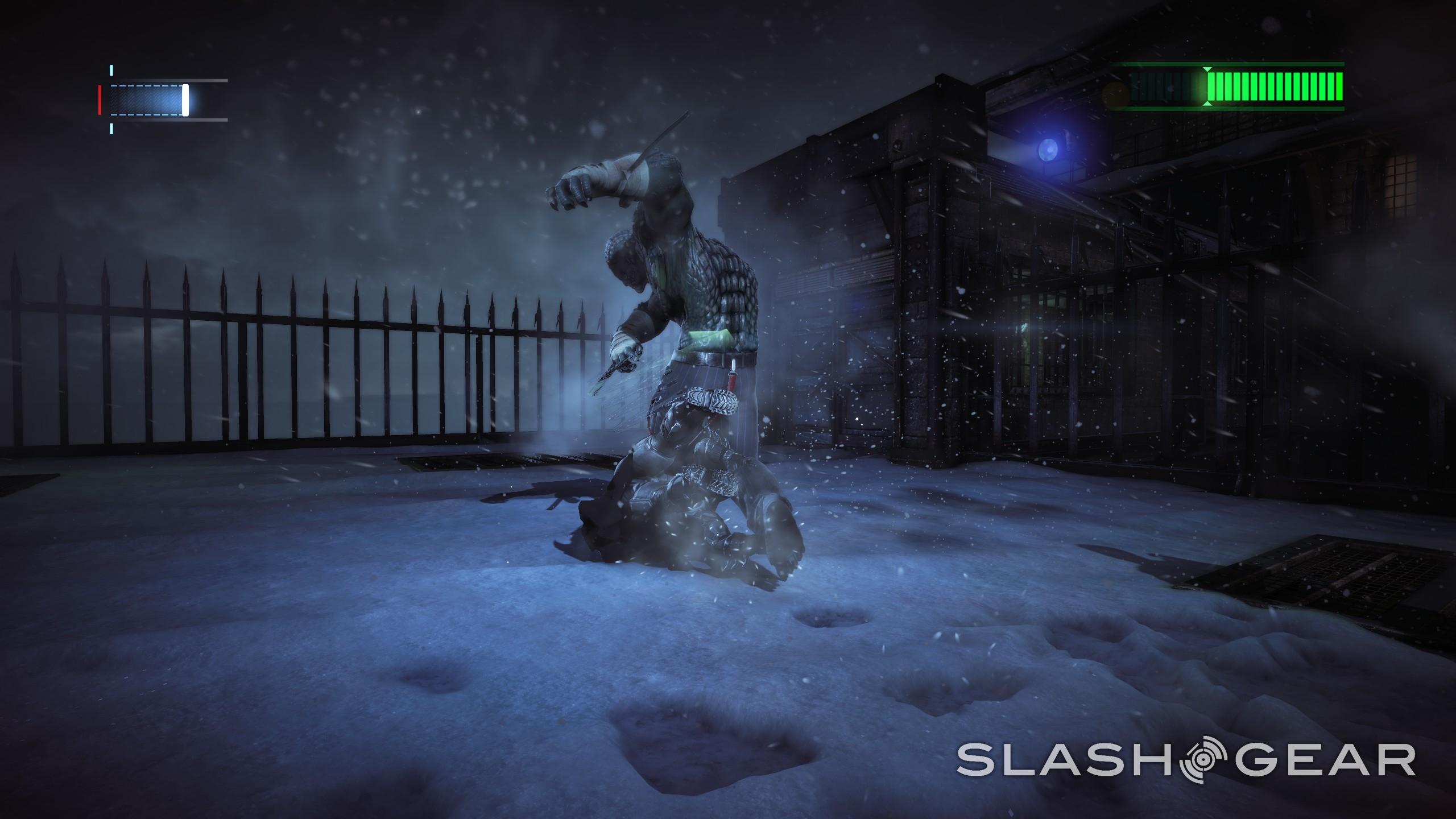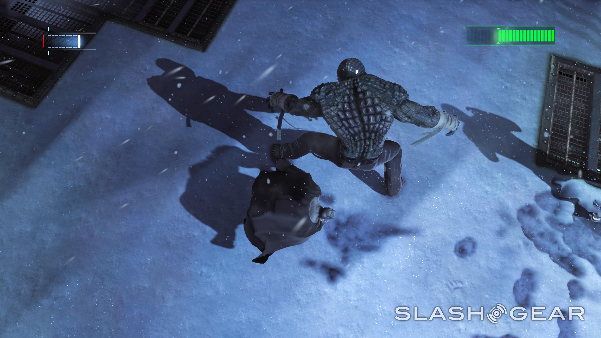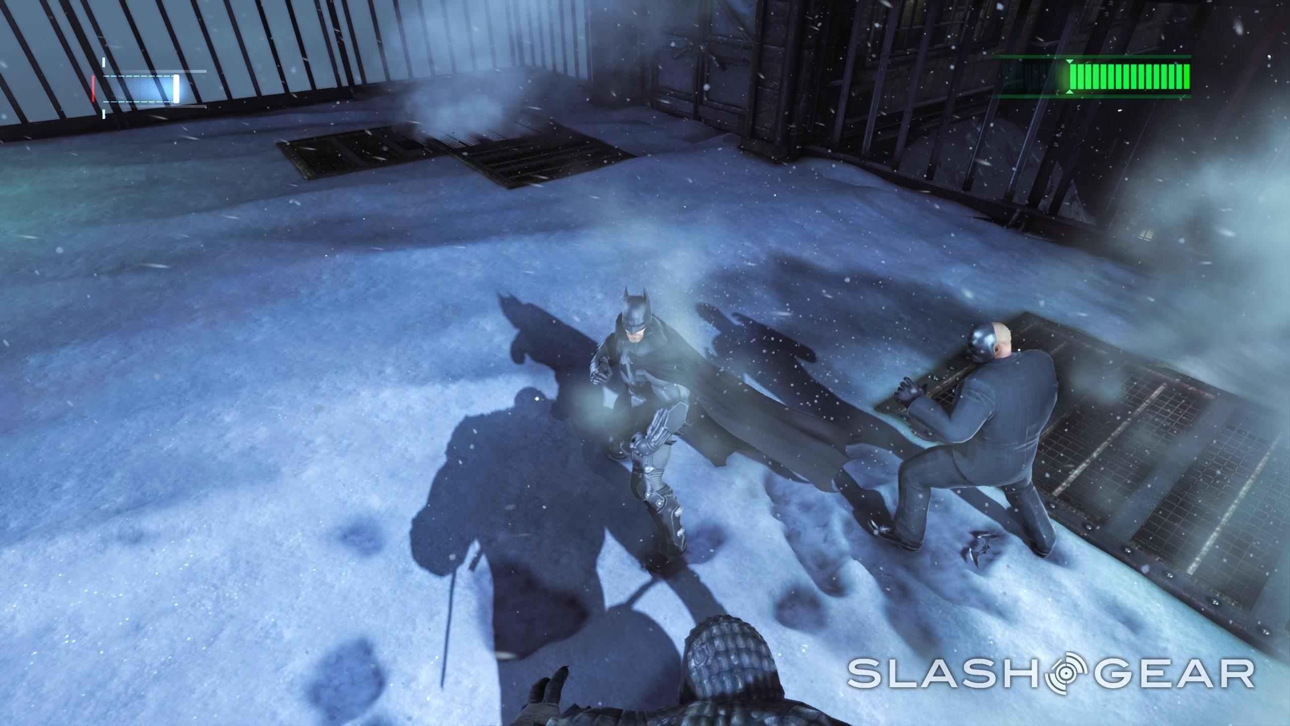 Here you'll find Batman's footsteps sticking – snow moves, and different locations have different amounts of snow. Snow falls from the sky and is moved when Batman flies through it. And this is only the beginning.