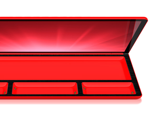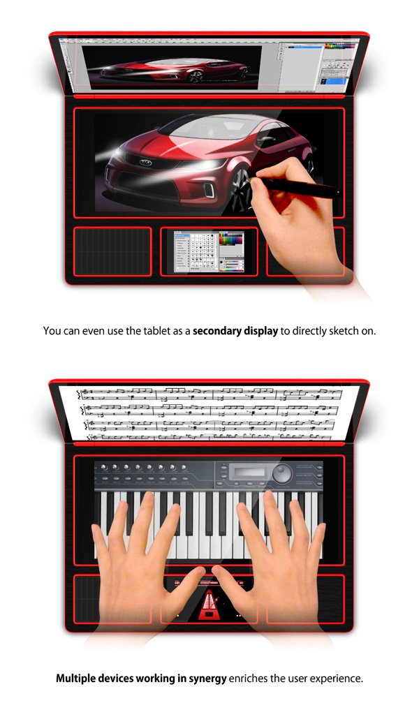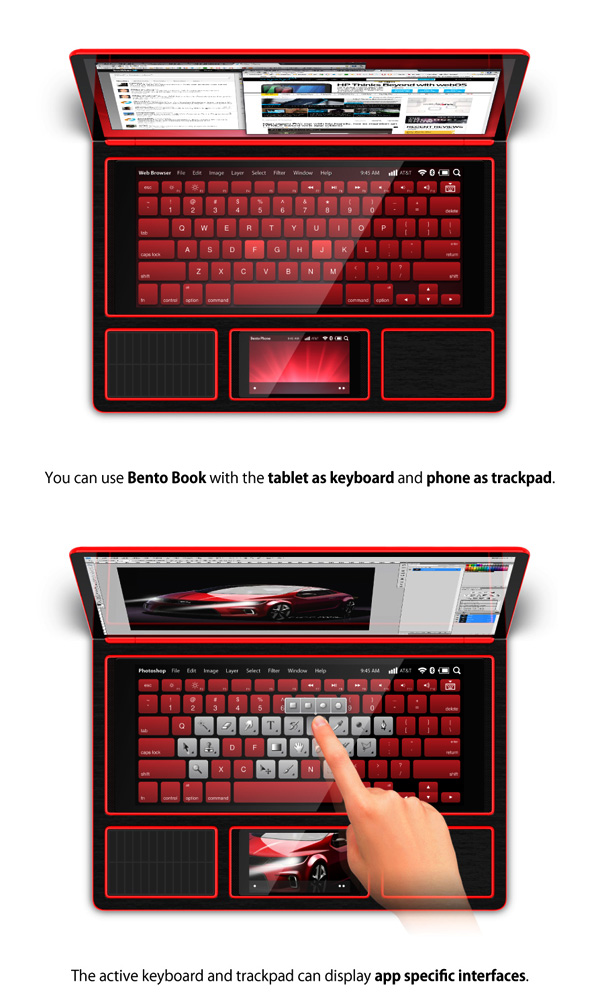 The entire device group, when closed, is only 15mm thick. While the notebook has none of its components plugged in, it acts only as a display. There are no batteries, storage, or processors built in. Once the additional four components of this device are docked, you've got a fully functional laptop which uses touchscreens for its keyboard and trackpad (or whatever else you need them to act as.) One of the more interesting conceptual uses for this setup to me is the Photoshop key changes – all your shortcuts at the press of a single button, displayed in the position of your keyboard.