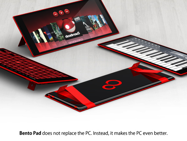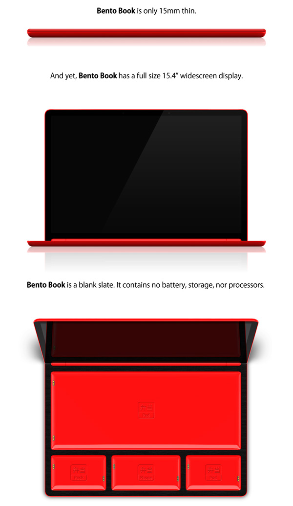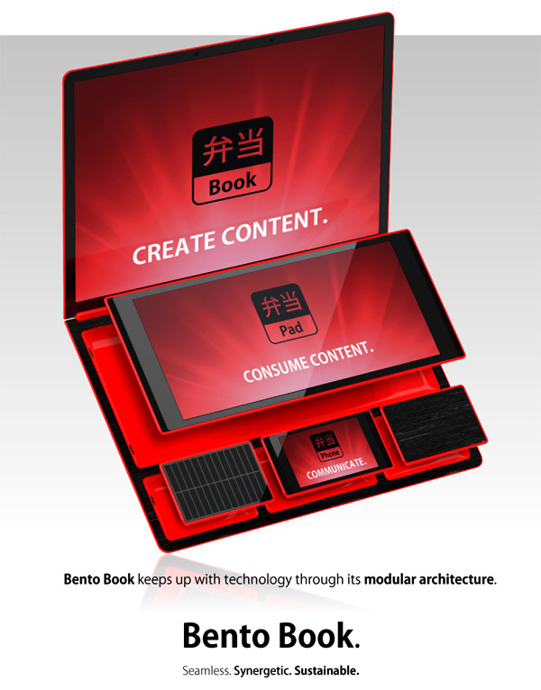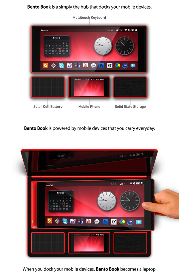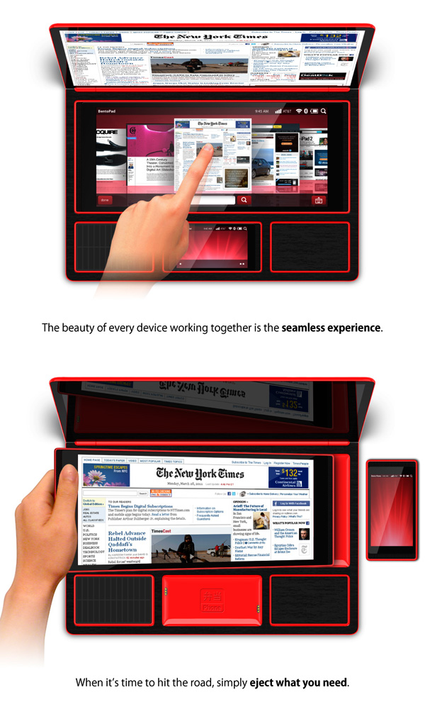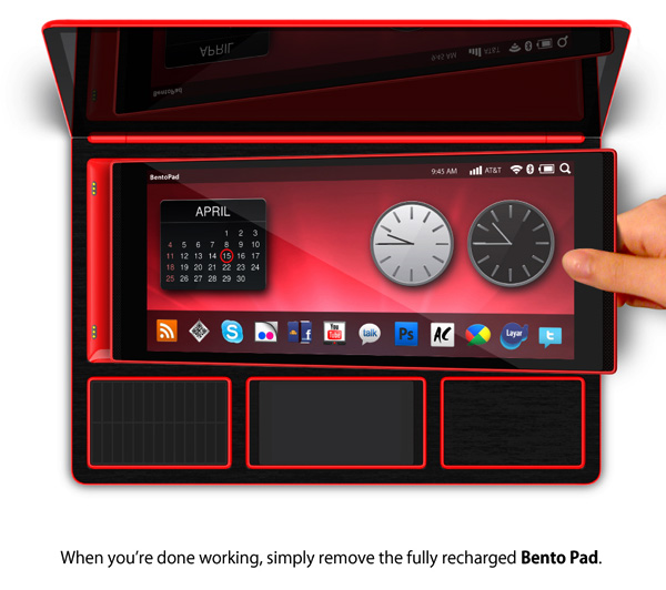 While this post began as a simple presentation of the industrial design concept we're about to take a look at, it transformed ever so slightly into a work that explores what the possibilities could be for touchscreen conglomerations such as this. The concept at hand is called the Bento Laptop Tablet Hybrid and it's designed and rendered by Rene Woo-Ram Lee. This concept is sent to us by our good friends at Yanko Design, a site dedicated to such conceptual works. This design features a laptop with a 15" OLED touchscreen, a 1TB SSD drive, a solar-powered lithium-ion battery, an 11" tablet computer and a 4" phone, all of these bits able to sit in shallow depressions in the base of the laptop and connect as one device.