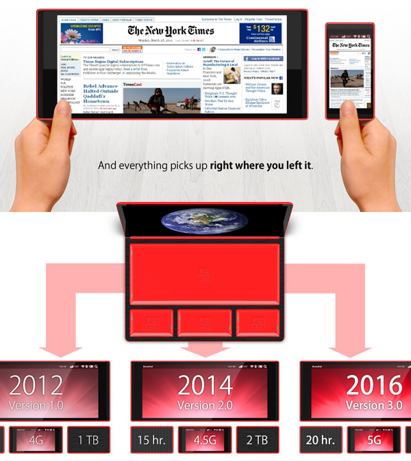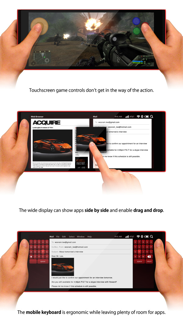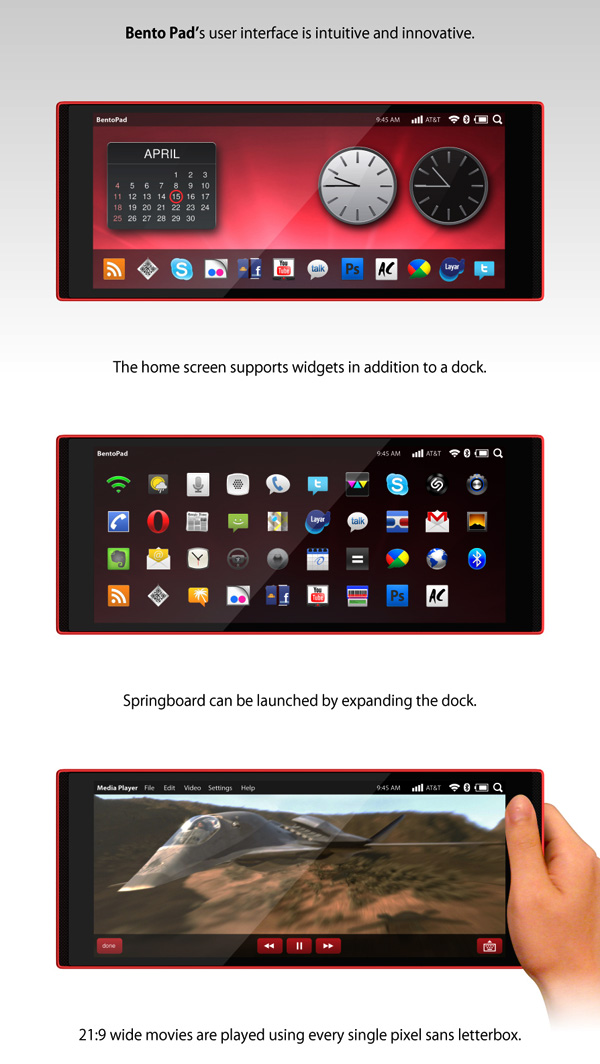 The interface for the devices included in this project appear to be something like a mix between Android and BlackBerry OS, but given the state of the project (very very early in it's conceptual stages,) it would be a farce to claim that it was either one or the other. What you're dealing with here is a 15.4" 16:10 OLED display having notebook in which several other components rest. The first and largest is an 11" 21:9 OLED tablet (that's long!), the second an extended solar powered Li-ion battery, next a 1TB SSD drive, and finally a 4" 16:9 OLED display toting smartphone.