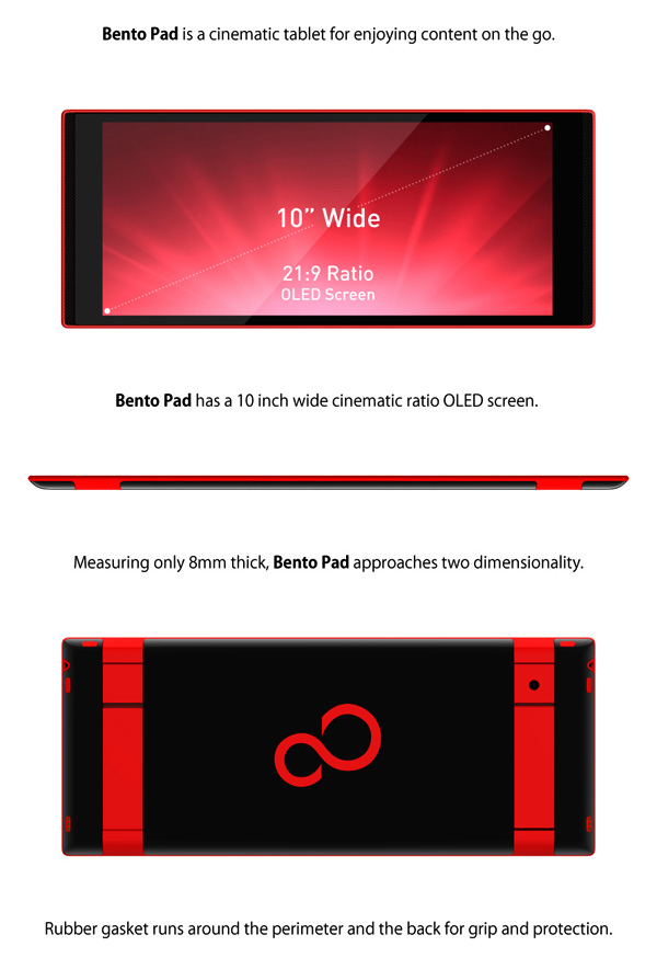 Then there's the physical aspects of the tablet. It's a 21:9 ratio 10-inch tablet – that's never been seen outside the Kyocera Katsura (which, incidentally, we're still very excited about.) The back of this tablet has a lot of rubber for superiority in grippage – excellent! There's a kick-stand built in as well – finally! It also has the ability to work as a bluetooth wireless keyboard – of course!
