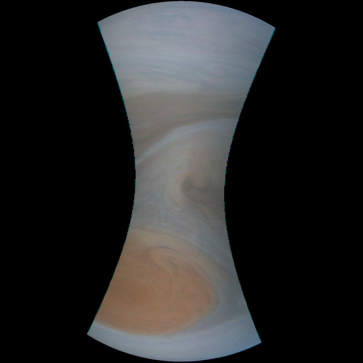 They were close enough to have kissed. Considering Juno and Jupiter are wife and husband in the Roman pantheon, that analogy is seemingly appropriate. But if the Juno spacecraft were indeed close enough to kiss, and crash into, Jupiter, it would be like kissing one big red pimple. Juno just completed its seventh close flyby of our solar system's biggest member and it has brought back some close up pictures of the Great Red Spot, the greatest storm we'll ever see.