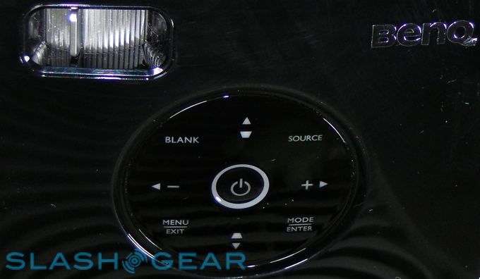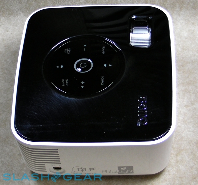 The hardware package is a mixed bag of success. The GP1 itself is an attractive, compact box measuring 5.4 by 4.7 by 2.1 inches and weighing just 1.4lbs, made from glossy fingerprint-loving black and white plastic and with a circle of touch-sensitive blue backlit buttons up top. Build quality seems good, and while there's no sliding cover the lens is deeply recessed into the body of the projector.