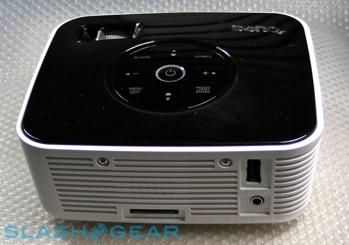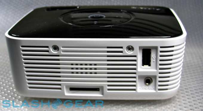 Connectivity is via a proprietary A/V port, with BenQ providing a combination VGA and composite cable for hooking up laptops, DVD players and the like. A $30 optional iPod dock is on the near horizon, too. There's also a USB 2.0 port, which can be used to plug in memory sticks filled with photos and videos; the GP1 is compatible with JPEG, BMP, GIF and TIFF images, and AVI, MP3, MOV, 3GP, 3G2, DivX and Xvid videos. Just underneath is a standard 3.5mm headphone socket, in case the projector's 2W speaker proves insufficient.