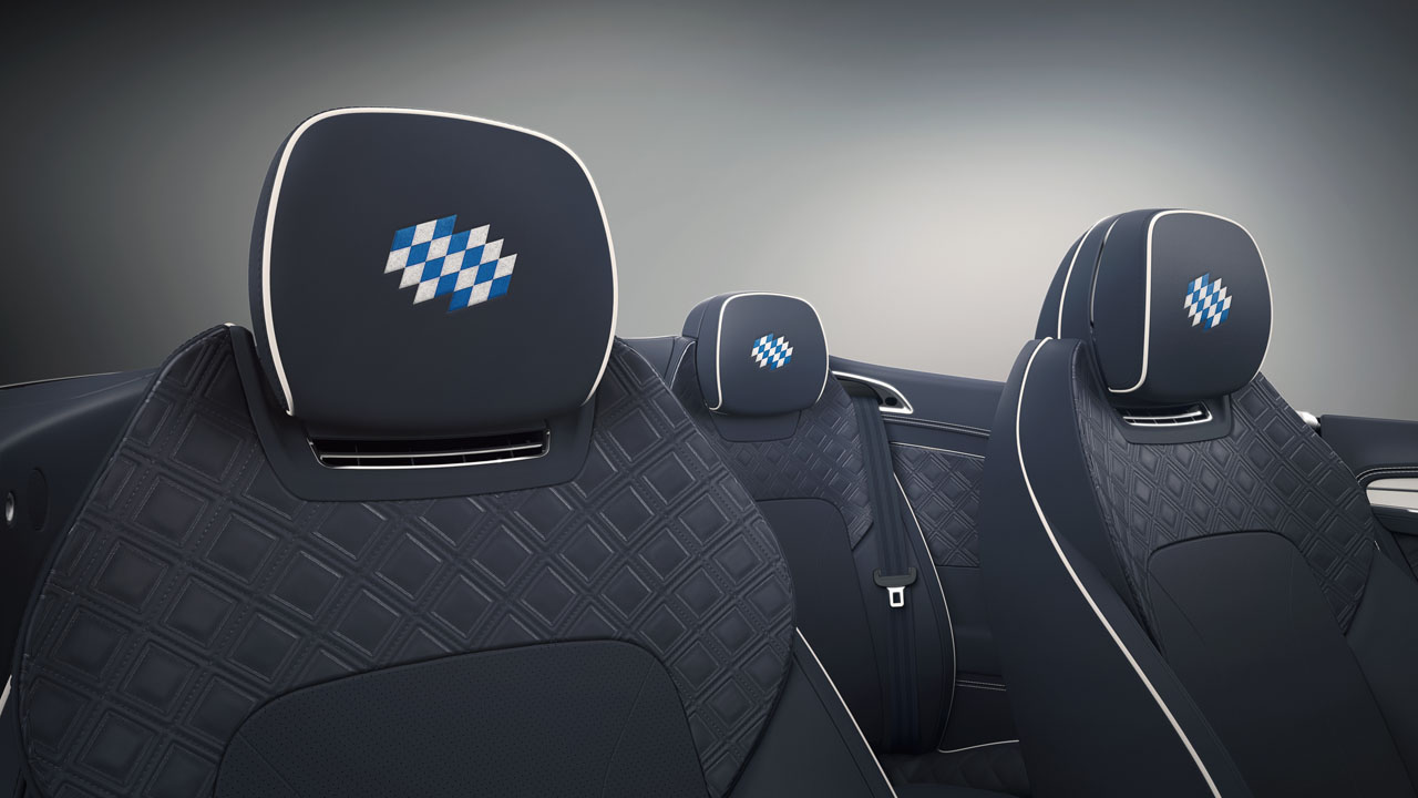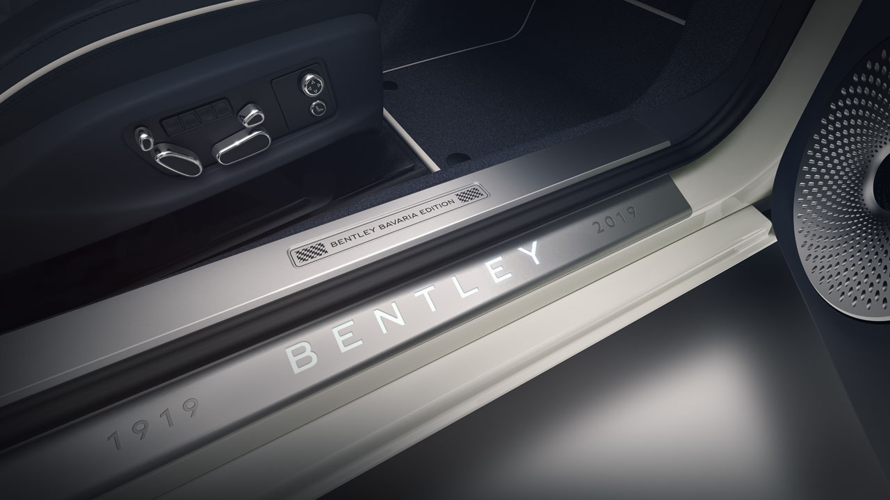The interior of the car has Bavarian flag pattern embroidered seat headrests in Bespoke White and Light Blue thread. The treadplates have a special Bentley Bavaria Edition inlay. The interior also has glacier white painted dual veneer with an imperial blue hide.