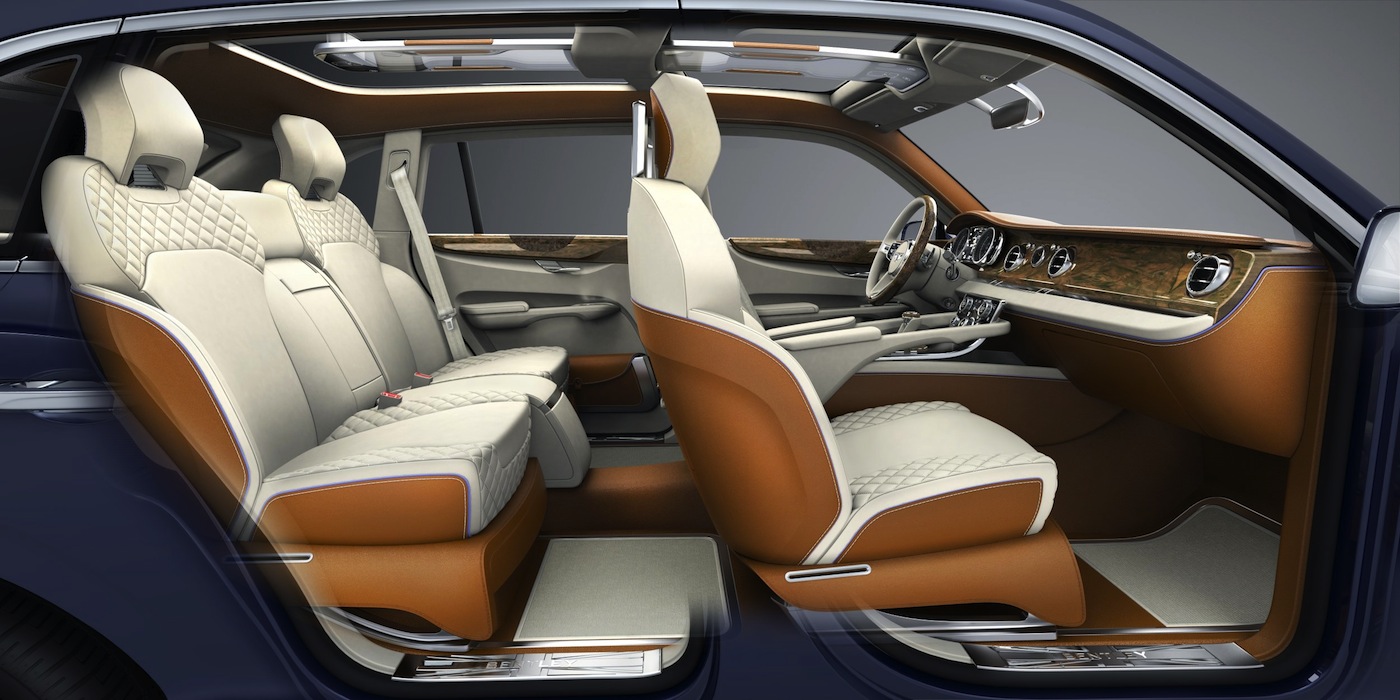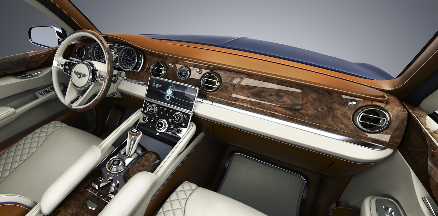 Since it's a concept, Bentley hasn't been able to resist spattering it with tech, so you get a 3D dashboard – almost certain to get scolded for driver-distraction - and plenty of touchscreens, nestled in among aluminum and bronze traditional dials. The frame of the dash has been made to double as a grab handle, and the wood veneer is actually a single piece spanning the whole width.