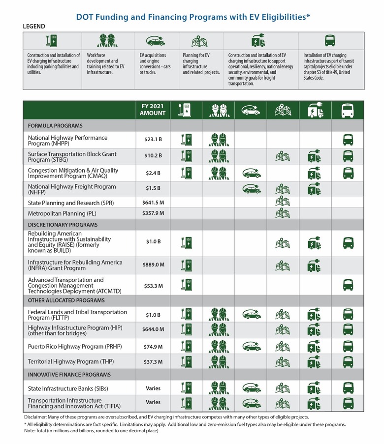 Most significant is the National Highway Performance Program (NHPP), which has $23.1 billion in 2021. That can be used for construction and installation of EV charging infrastructure, including parking facilities and utilities, the DOT points out, in addition to workforce development and training in areas related to EV infrastructure, and indeed EV charging facilities for transit capital projects. Similarly, the $10.2 billion Surface Transportation Block Grant Program (STBG) and $2.4 billion Congestion Mitigation & Air Quality Improvement Program (CMAQ) can also be used in the same ways.