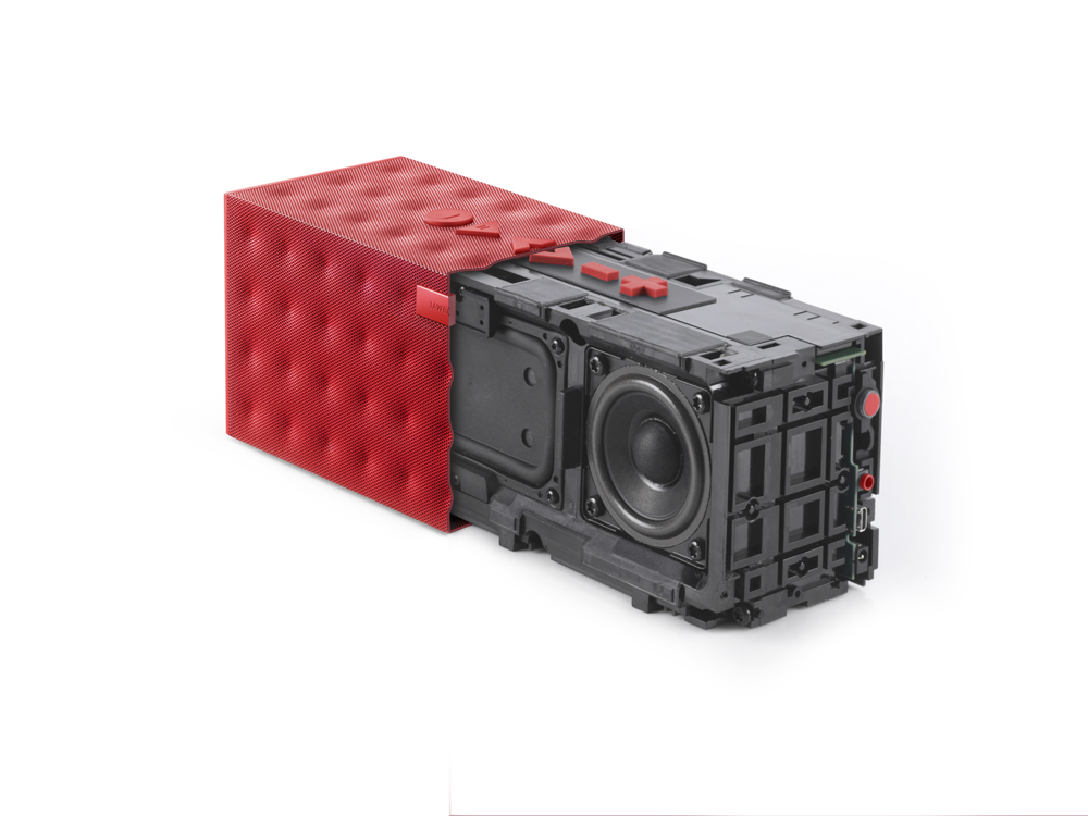 Externally, it's a wrap of perforated steel capped with elastomer end panels, with the mesh finished in one of three patterns: either dotted, on the red model, waved, on the white, or honeycombed, on the graphite. The larger top panel gets three extra buttons, the talk and volume keys joined by play/pause and previous/next. A power button and a pairing button are on the right end-cap, along with a 3.5mm line-in port, a microUSB port and a charging port.