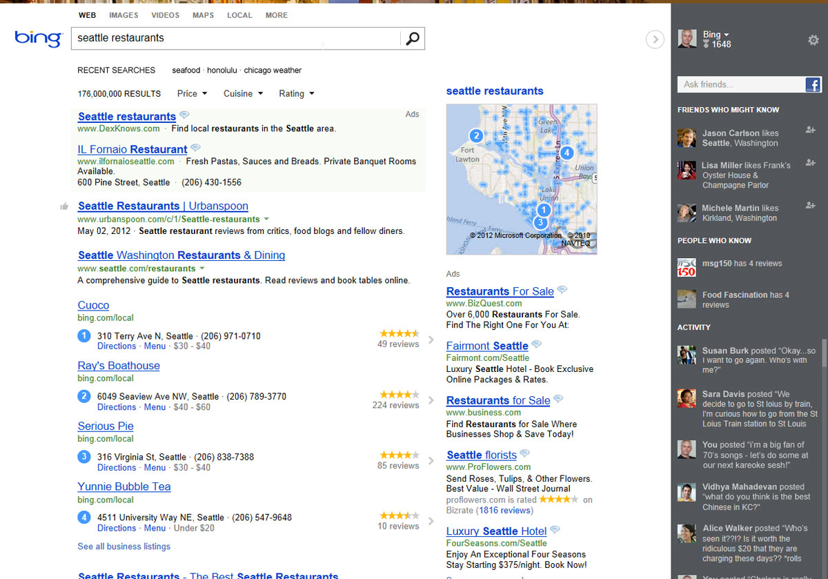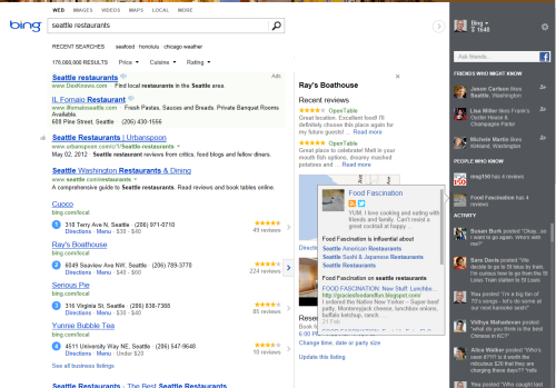 Furthermore, Bing will also suggest external experts from Twitter, Foursquare, Quora, LinkedIn, Google+ and Blogger who might also be able to help. The sidebar will also hold the Activity feed, a record of all ongoing and previous queries.