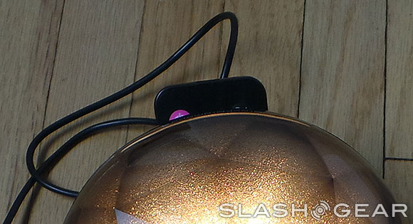 You'll be using the included remote to make all the lighting action a reality. If you lose the remote, you're going to be right on out of luck, because there's no other way to control this orb. The creators of this machine have kindly included a lovely little port in the back of the orb for storage of the controller, thankfully, so you shouldn't have to worry too much about loss. After that, it's jut a matter of deciding which device you want to connect to this miniature Epcot Center Spaceship Earth-like concoction.