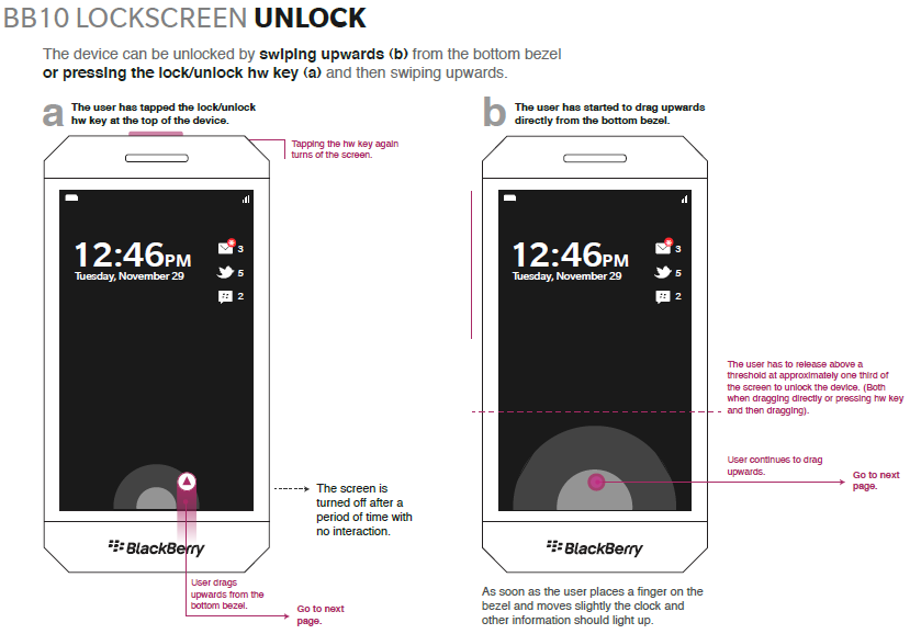 Some of BlackBerry 10's behaviors are also explained, for instance the OS showing the four most recently used apps as soon as you unlock. There's a little Harmattan/MeeGo-style homescreen pane swiping going on too, with the task-switcher being flanked by a full app launcher to the left and a universal messaging inbox to the right.