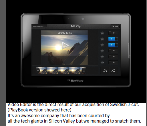 The screenshots show a pared back, more modern UI than the current BlackBerry 7 interface. The lockscreen has clearer notifications for missed calls, messages, tweets and other alerts, as well as a shortcut to the camera app, and RIM has baked in the results of some of its more recent acquisitions, like the video editor produced by Swedish firm J-cut.