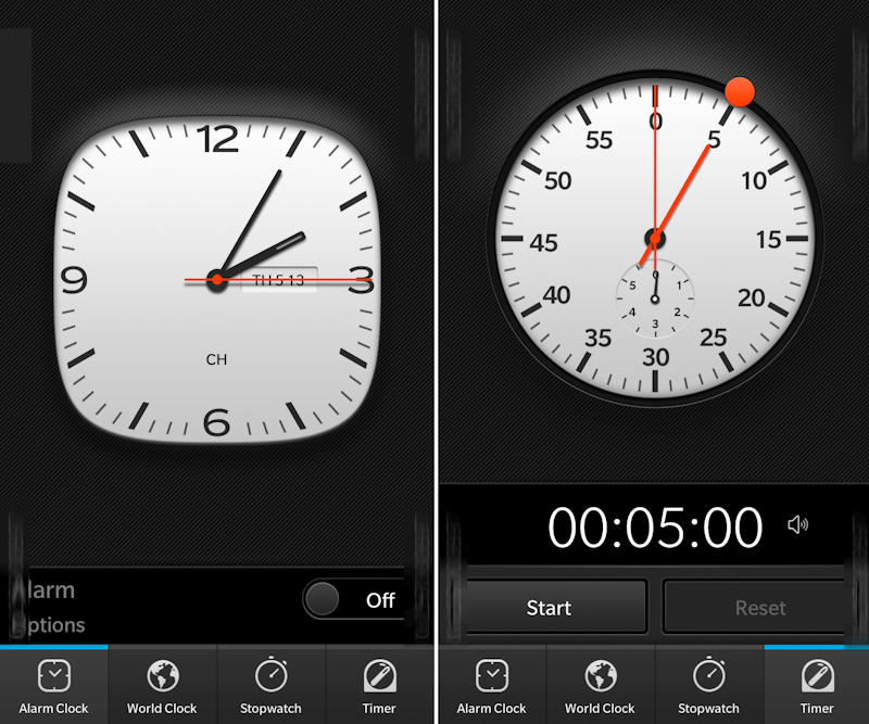 The screenshots show off a combination of the operating system itself and some social apps, including Facebook and Foursquare, which resemble what you find on Android. There's a look at BlackBerry Hub and the BBM menu. One of the screenshots shows off two of the clock options: Alarm Clock, which is square-ish, and Timer, which resembles an analog stopwatch.