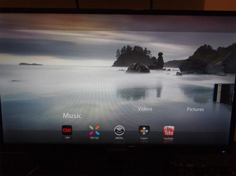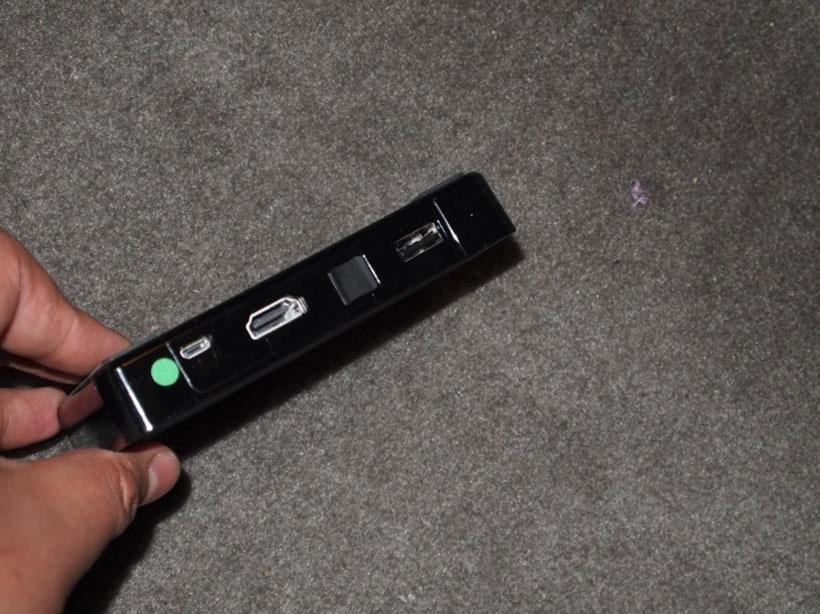 The images show a smallish box with a microHDMI port, USB port, and HDMI port on the back. It also has a small remote control with a d-pad and three buttons. One of the shots shows the software interface offering links to CNN, Slacker, YouTube and more.