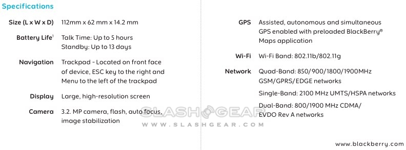 The whole thing measures in at 112 x 62 x 14.2 mm and RIM reckon you'll see up to 5hrs talktime or up to 13 days standby from a full charge. Although the spec sheet proudly declares you can use simultaneous voice and data, it's worth noting that the data connection has to be via WiFi, not 3G. No word on pricing, but according to the earlier leak the BlackBerry Bold 9650 should arrive on Sprint in the US come May 2010.