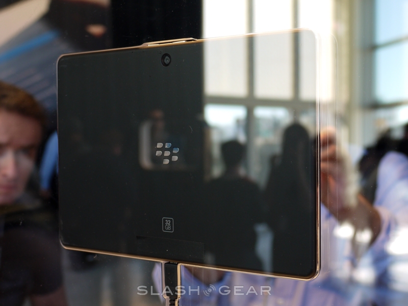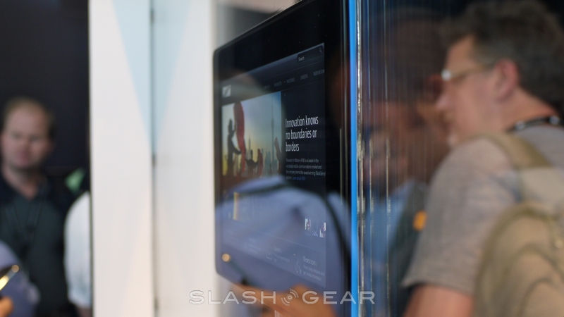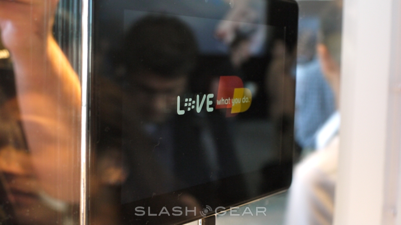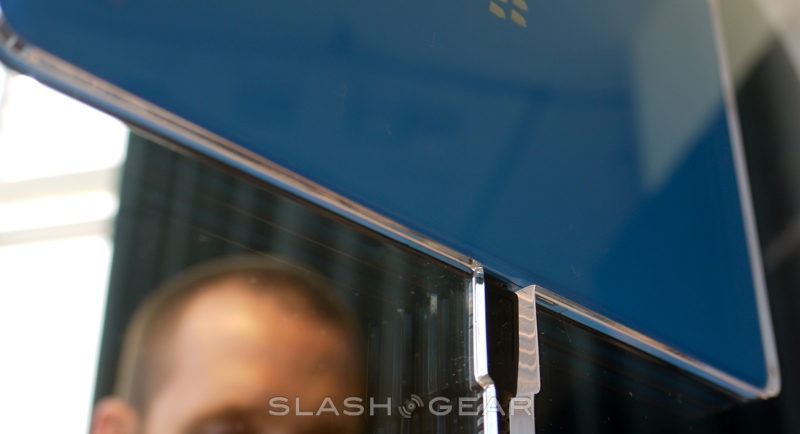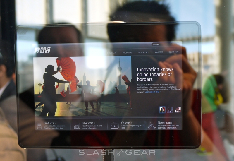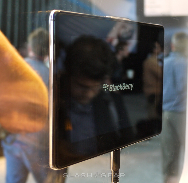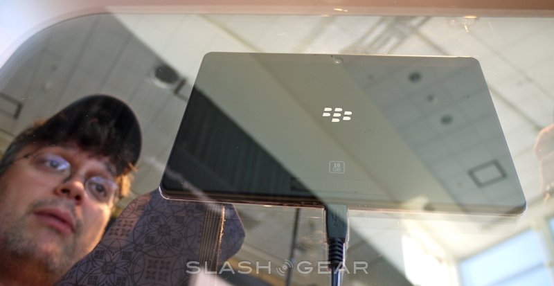 At DEVCON today, Research In Motion unveiled the BlackBerry PlayBook tablet device. It's a 7-inch display, with a 1GHz processor under the hood and a capacitive touchscreen. It's positioned by RIM as the first "professional tablet," and with that in mind we were looking forward to getting some preliminary hands-on time with the device, but that didn't happen today. Unfortunately, the three models that RIM had on display were unreachable, so our "close-up" was not as close as we would have liked.