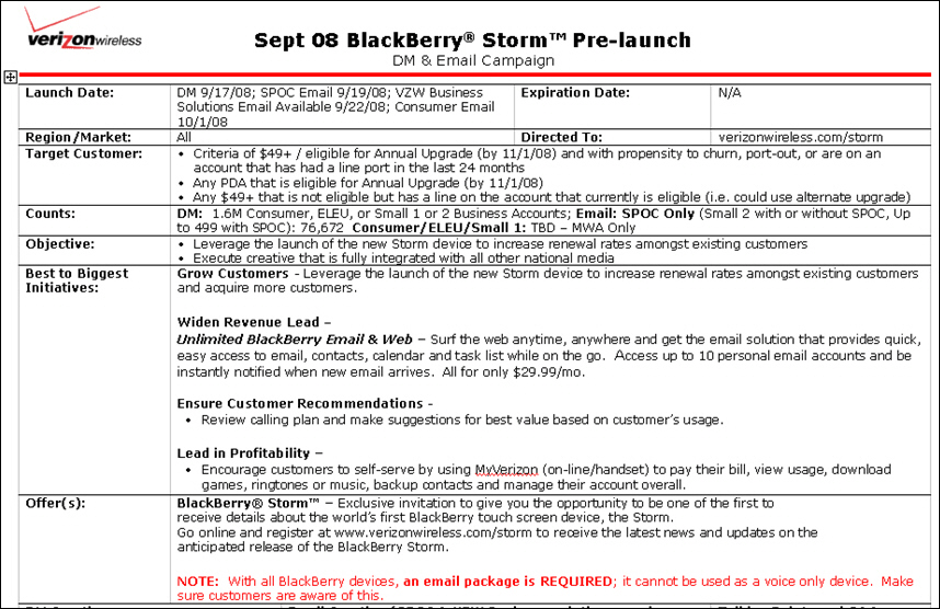 Generally sales tactics are as you would expect: Verizon sales staff are told to target customers likely to, or with a history of, swapping carriers, in the hope of locking them into a 24-month contract. The Unlimited BlackBerry Email & Web package is priced at $29.99 a month.