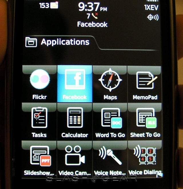 The browser is also the same as on the Bold, with a dedicated search box to query Google, Wikipedia and Dictionary.com, and better access to bookmarks.  Navigation is certainly more straightforward than using a trackball, but to be fair we're still playing with the browser and will come back to this important feature in part two of our review.  Right now, though, we're less than impressed with the accelerometer responsiveness: it takes 2-3 seconds to transition between portrait and landscape orientations.  BlackBerry Maps, the new media player and the camera/video app are all present, together with a new Facebook for BlackBerry program and a Flickr browser.  We'll also be covering these applications in part two, but we can say now that the Facebook app doesn't seem as comprehensive as that on the iPhone, and the Flickr software is very much bare bones in terms of features.