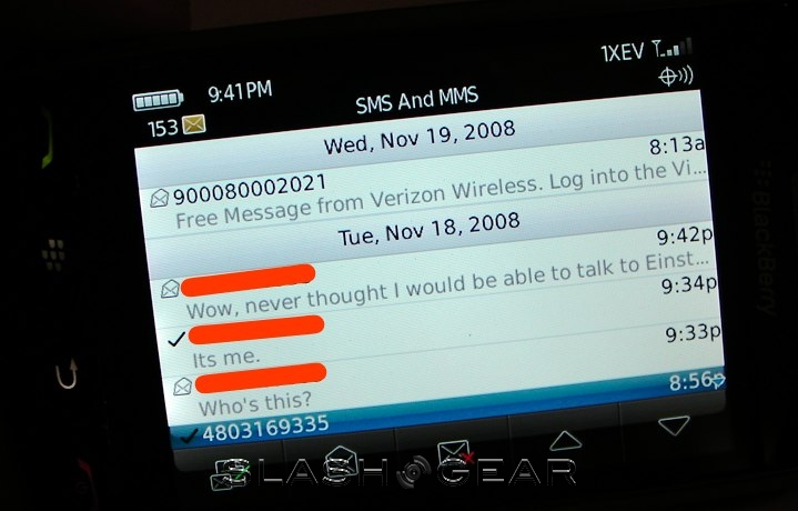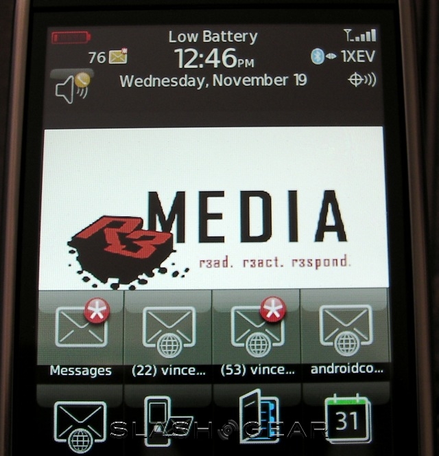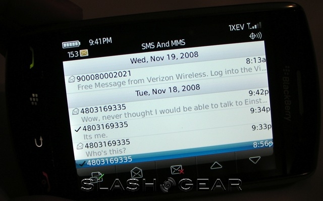 Preloaded applications include RIM's usual messaging suite, here with support for HTML email, attachments and inline images, their organizer and SMS/MMS.  Much of the email rendering is done off-handset on the BlackBerry email servers, and while we say HTML it's not exactly full support.  Still, basic formatting (such as bold, italic and underline) and included images are arguably all you need on a mobile device, and the rendering speed benefits are pleasant.