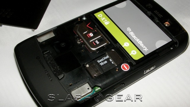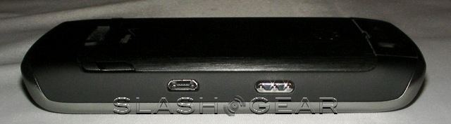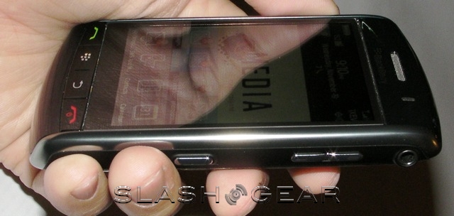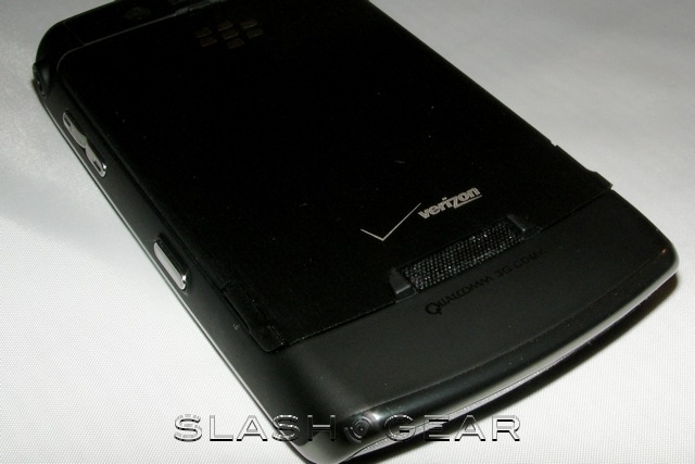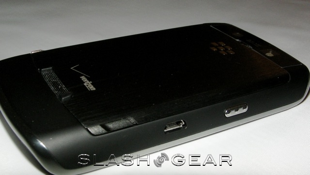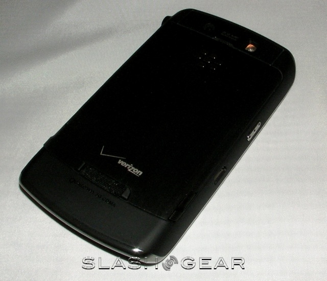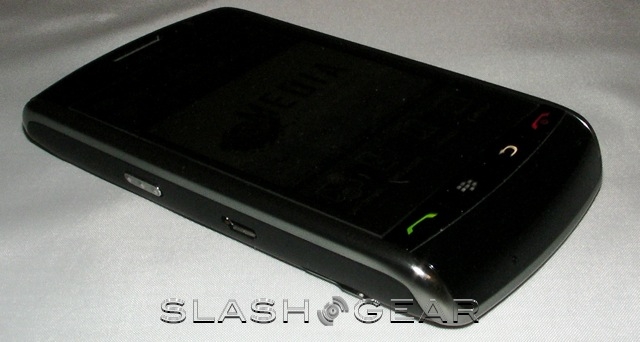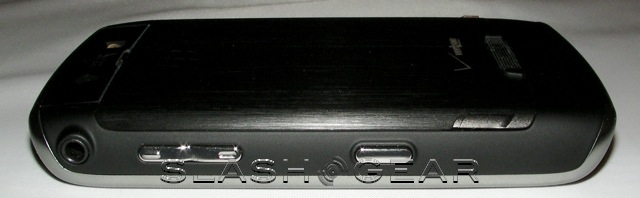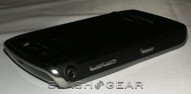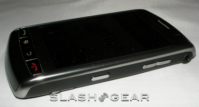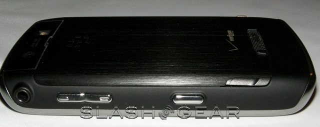 Moving around the device, on the top there are the lock and mute buttons on the top left and right sides, respectively, hidden as capacitive controls in the black screen surround.  On the left there's a dedicated voice-dial button, while on the right there are volume up/down keys and the camera shortcut key.  The headphone jack is also on the right side.  Finally, from left to right on the front, there are call, menu, back and end-call buttons.  Holding down the menu key brings up a task list from which you can switch between running apps.  The Storm measures 4.43 x 2.45 x 0.55 inches and weighs 5.5oz.