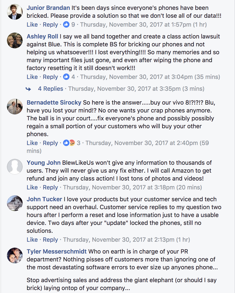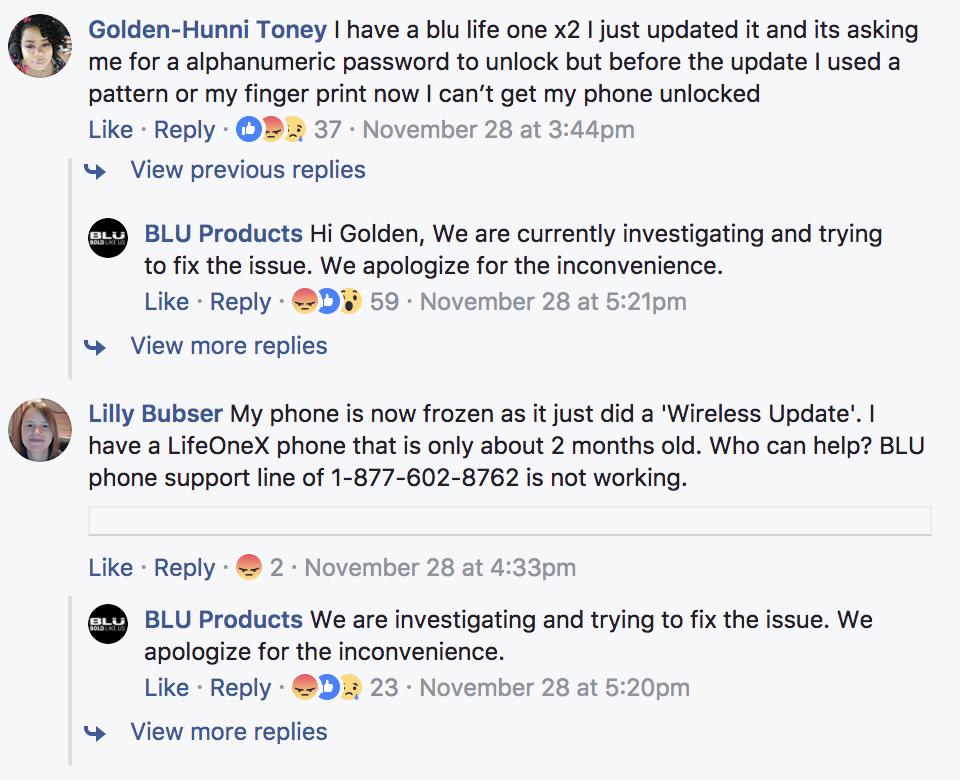 The gallery above shows all the Facebook posts the official BLU account's released over the past several days. Each one of these posts is littered – JAMMED – with comments of wild madness courtesy of customers with bricked handsets. BLUs userbase is not pleased.