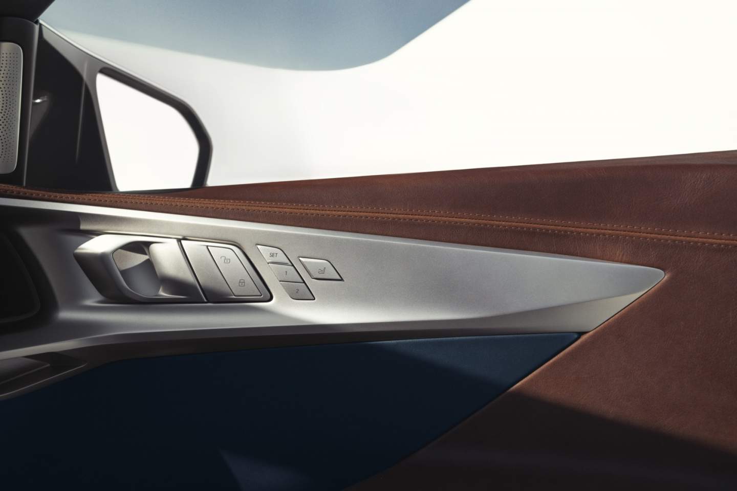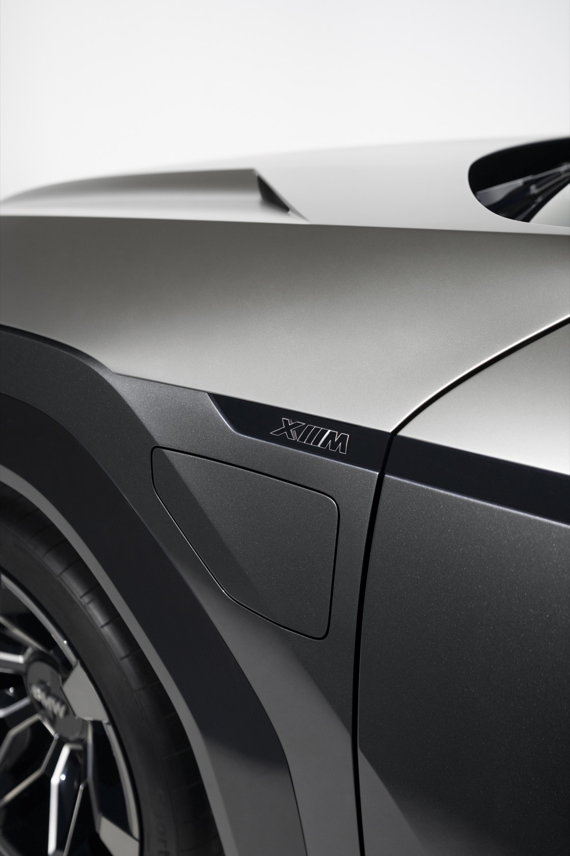 From the side, the glass tapers toward the rear, with the roofline a stretched slope. Two-tone paint features matte gold-bronze on top and Space Grey Metallic on the lower section. A "black belt" gloss-finish boundary separates the two, and BMW adds the charge port just behind the front left wheel. 23-inch light-alloy wheels – with self-leveling center logos – give the XM just the right degree of stance.