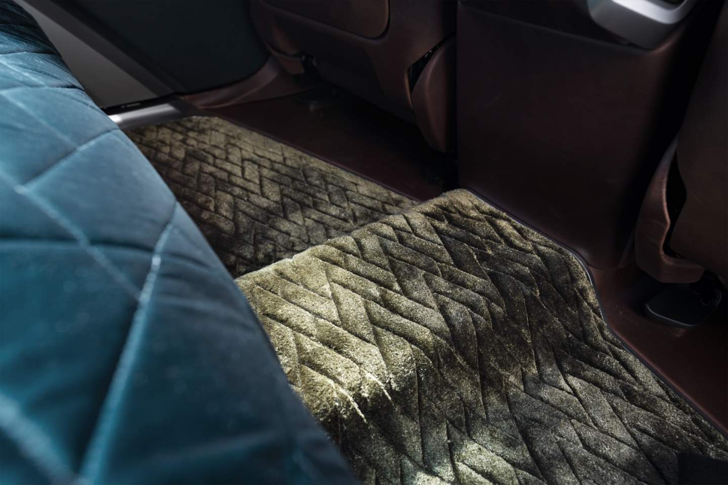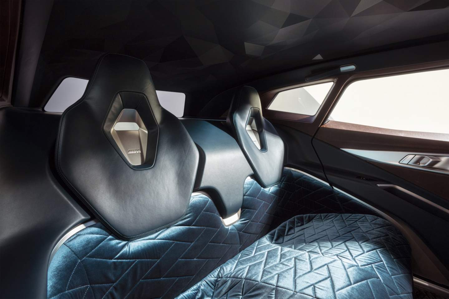 In the rear, meanwhile, luxury moves to the fore. BMW refers to it as an "M Lounge," with black-tinted rear windows, a deep aquamarine Petrol color way, and velvet with diamond quilting. Matching pattern deep pile carpeting and a deeply-recessed bench promise to envelop passengers as they look up at the 3D prism structure headliner. Picked out with indirect and direct lighting, and joining the cabin's other ambient lighting, it's a mesmeric geometric light and shadow show.