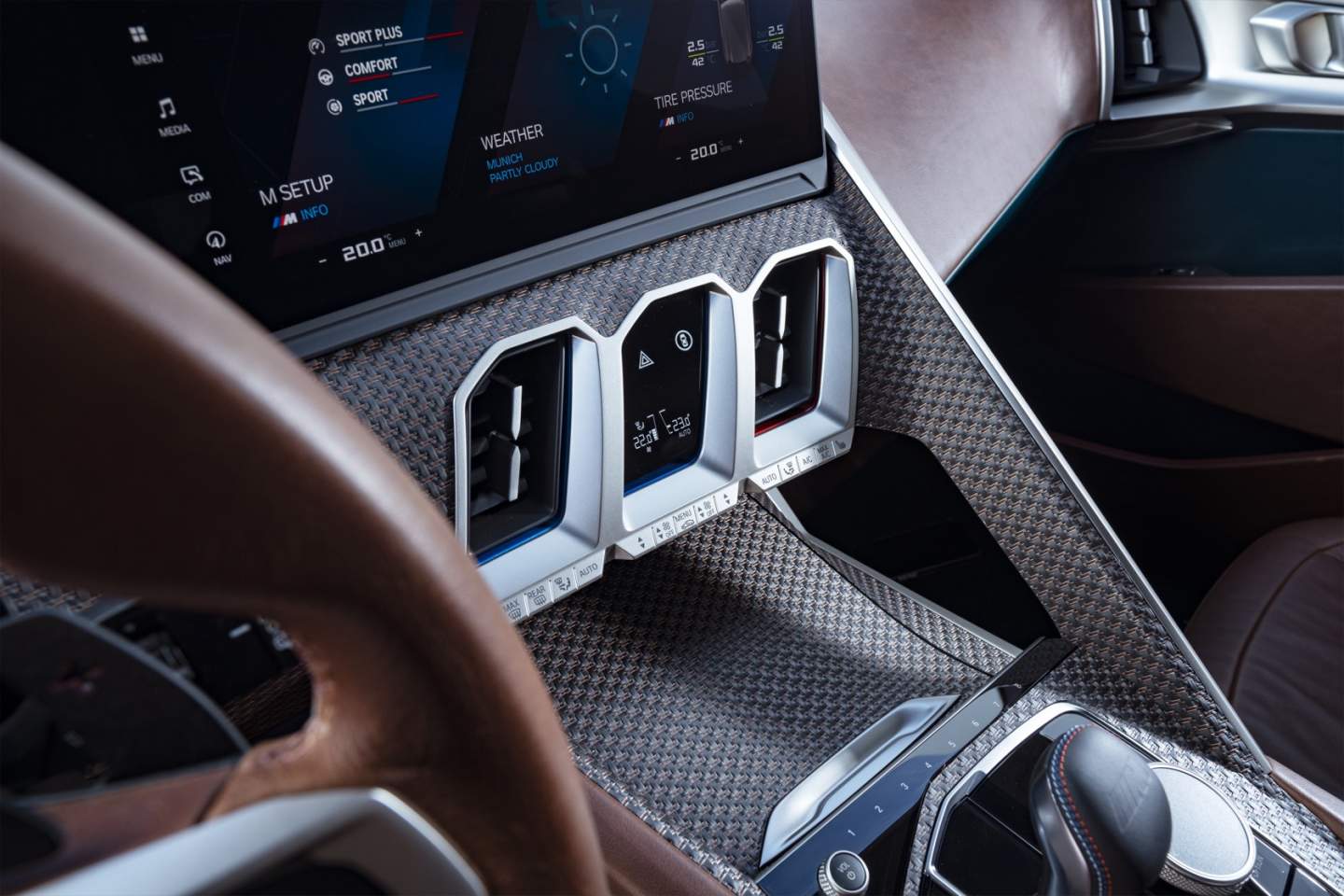 A BMW Curved Display takes care of the important gauges, while carbon fiber with interwoven copper thread picks out the HVAC controls and air vents. A trio of vertical elements in the center console borrow the trio of colors from the BMW M brand logo.