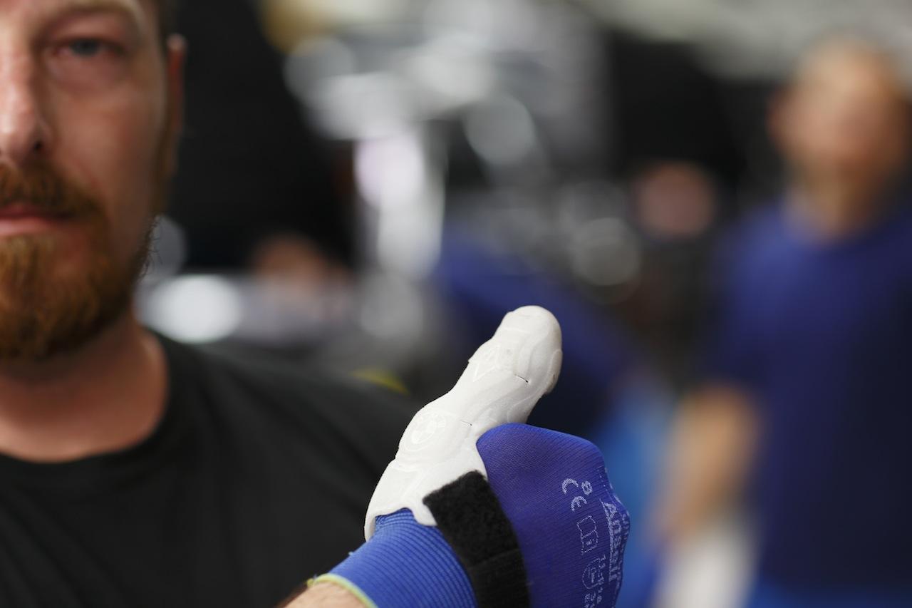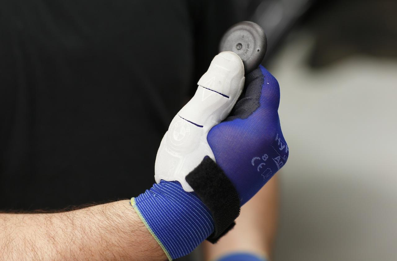 Traditionally, it would be a case of stabbing the bungs into place with the thumb, but that can put undue pressure on the hand. What BMW and the Department of Ergonomics at the Technical University of Munich are trialling is whether thermoplastic polyurethane thumb-guards could be the answer.