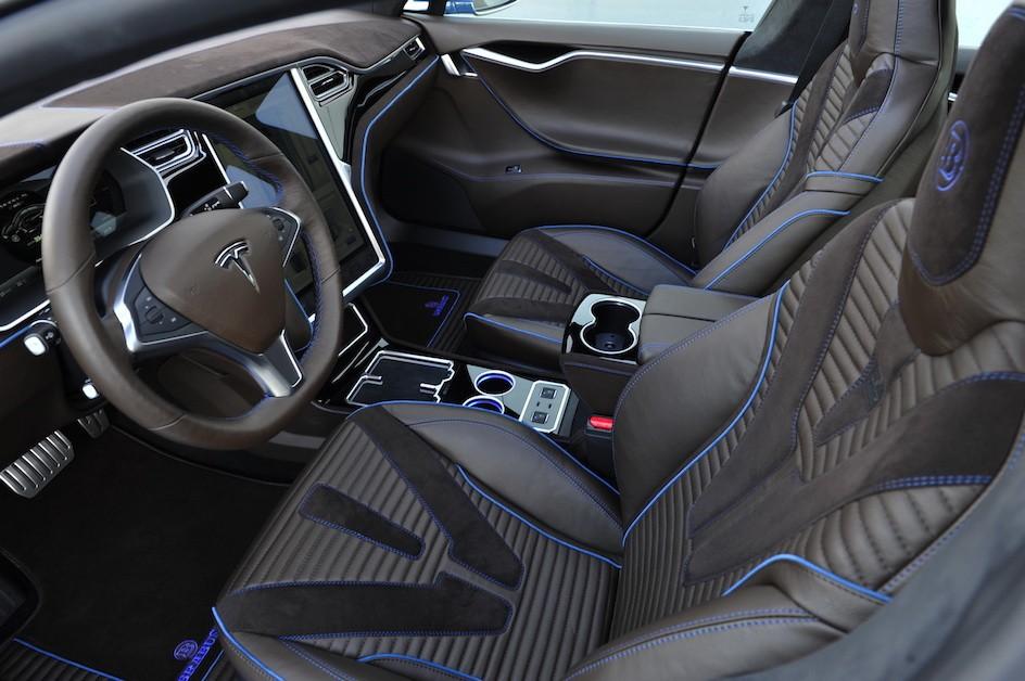 Brabus has a pretty well-defined exterior look they apply to their Mercedes vehicles, and while it's apparent on the Model S, they haven't gone overboard. The most noticeable change is the electric blue paint scheme with a matte finish. Up front, carbon air intake extenders have been added to each side, offering a slightly more aggressive look, but also getting extra air to the car's radiators.