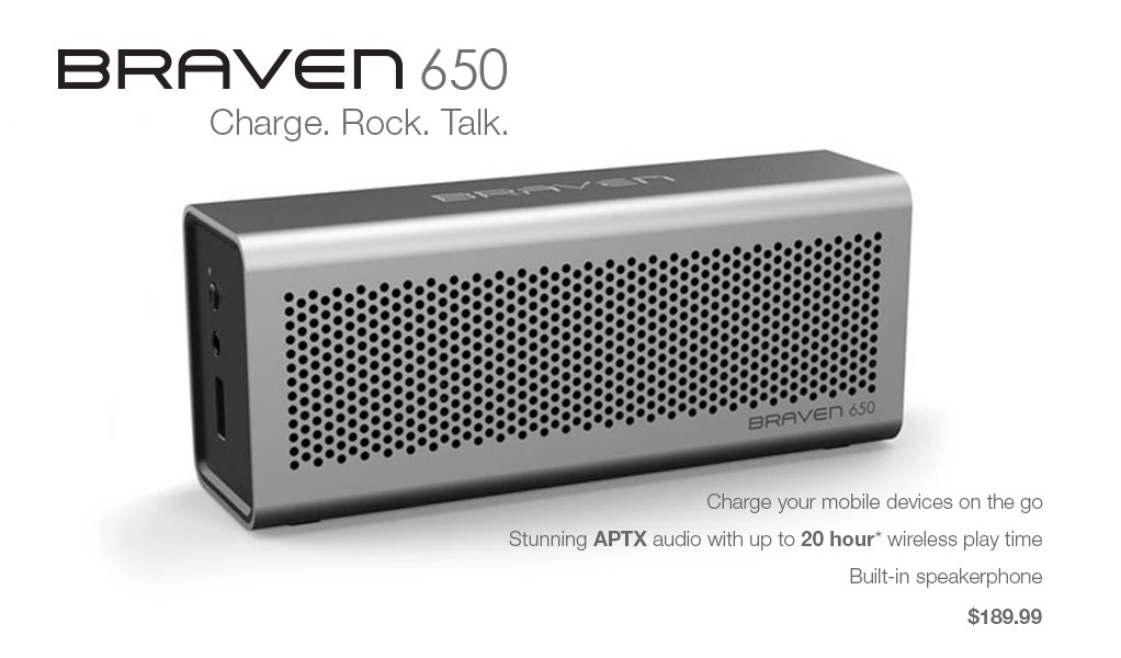 There are three new models being announced today: the Braven 600, 625s and 650. the 600 is naturally the cheapest among them at $149.99, and features an aircraft aluminum body in either Ash Grey or Moab Red. The battery is rated for 14 hours of continuous playback. The 625s adds a ruggedized exterior in black with various gear design for the outdoorsman, including a waterproof bag and a USB flashlight. The $179.99 jet black 625s is rated for 16 hours of playback. The high-end 650 copies the aluminum styling of the 600, but adds aptX and AAC audio encoding and 20 hours of playback. The plain aluminum 650 is rated for 20 hours, and will cost $189.