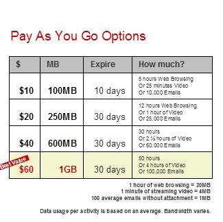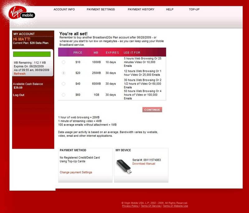 Broadband2Go My Account Portal ScreenShotLike Virgin Mobile USA's mobile phone service, activation is simple and megabytes can be added as often as needed with credit/debit cards or Virgin Mobile Top-Up cards. Top-Up cards can be used to purchase data usage from 100MB to 1 gigabyte on the pay-as-you-go model. A new Broadband2Go-branded Top-Up card for $20, which customers may use to purchase 250MB good for 30 days, translating roughly into 12 hours of web browsing. Other data plans are available at $10, $40 and $60, and any VMU Top-Up card can be used.
