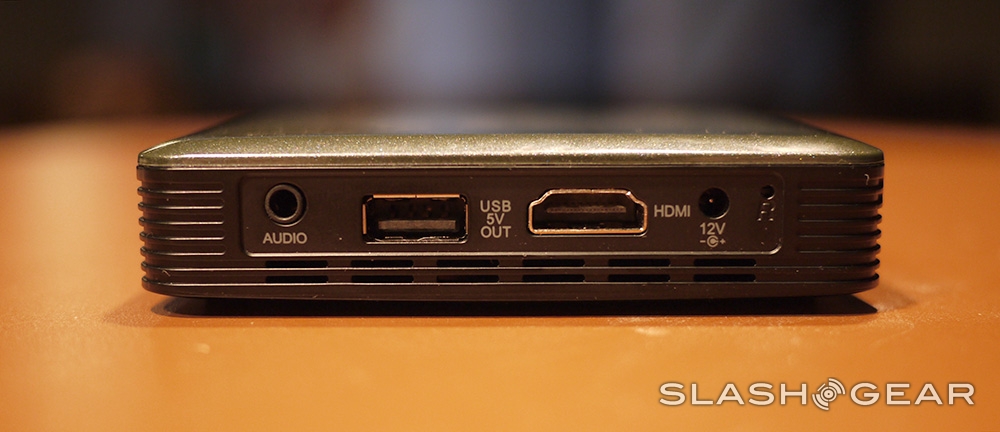 The Brookstone HDMI Pocket Projector contains a 3800mAh battery that's both rechargeable and is able to act as an output battery for your mobile devices through the projector's full-sized USB port. This means that if you've got a smartphone that you're using to output to HDMI and you're in need of some extra power for the phone itself, you've only to plug into the projector with your standard USB cord to the phone. Of course that means a much quicker drain on the battery that's already working quite hard if you're projecting at the same time, but there's always the chance of emergency – and you won't find this feature on one whole heck of a lot of similar devices either, I can tell you that.
