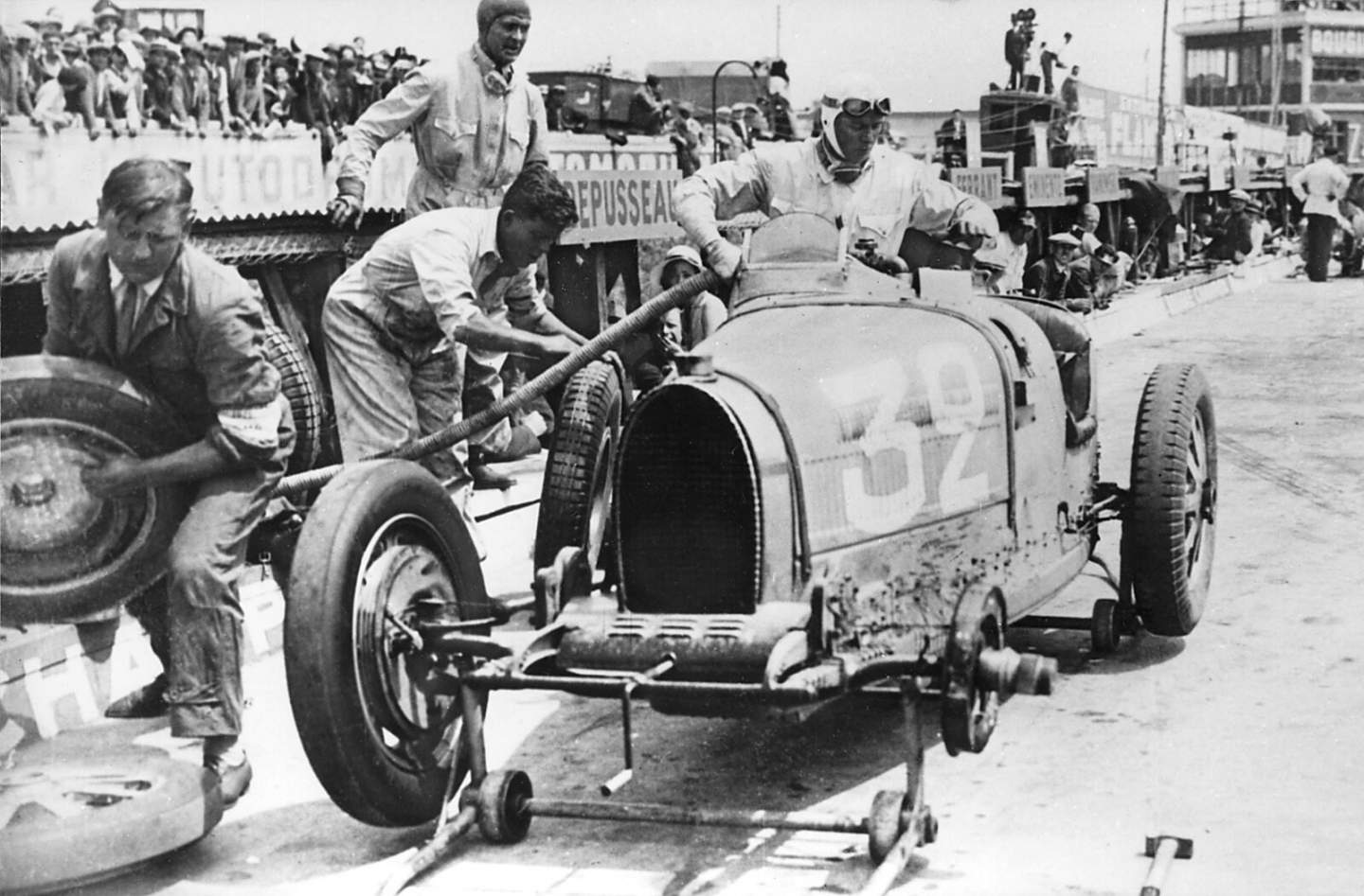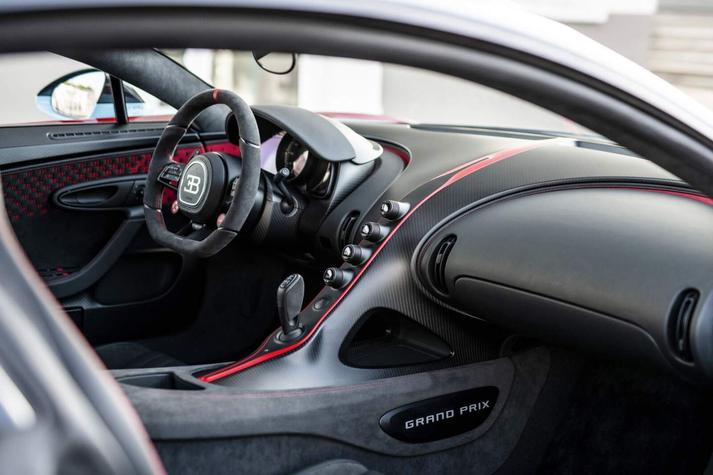 The number 32 motif continues inside the cabin. There are "32" emblems on the headrests plus fading EB stripes on the door panels. Additionally, the Grand Prix moniker is on the transmission tunnel and door sills, reminding the customer of Chiron's historic win at the French Grand Prix.