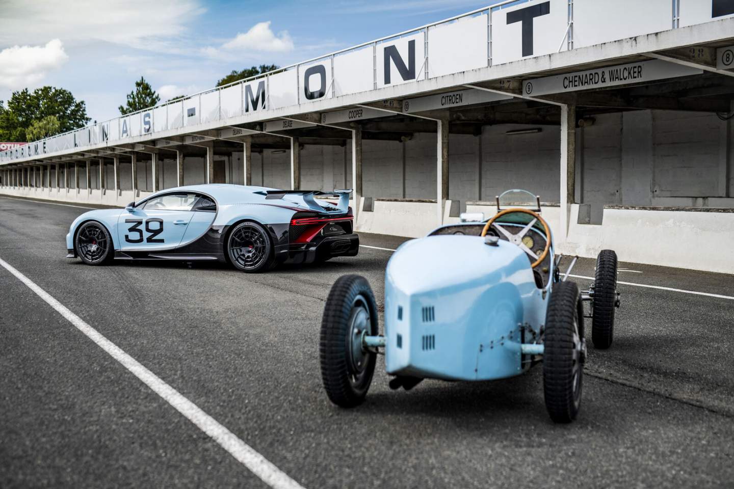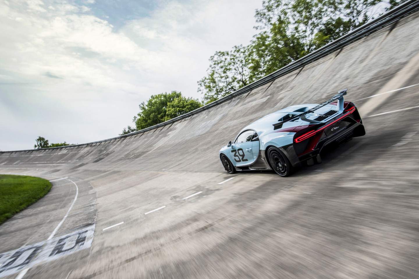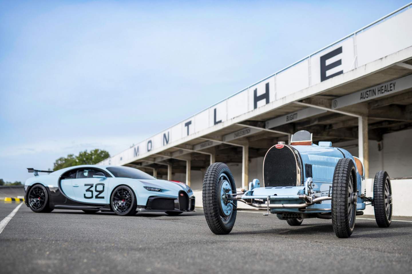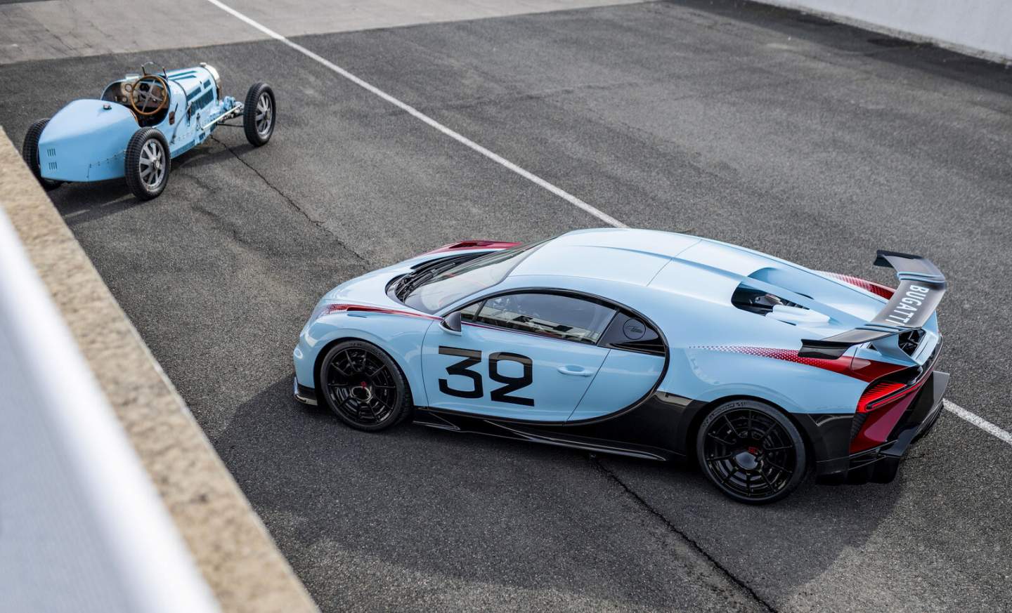 Drawing inspiration from the Bugatti Type 51 racing car of legendary racing drivers Louis Chiron and Achille Varzi at the 1931 French Grand Prix, the customer wants a Chiron Pur Sport that immortalizes the racing heroics of vintage Bugattis. Wearing a handpainted number 32 logo and Baby Blue paint job, the creative minds at Bugatti Sur Mesure worked to conceptualize a Chiron like no other.