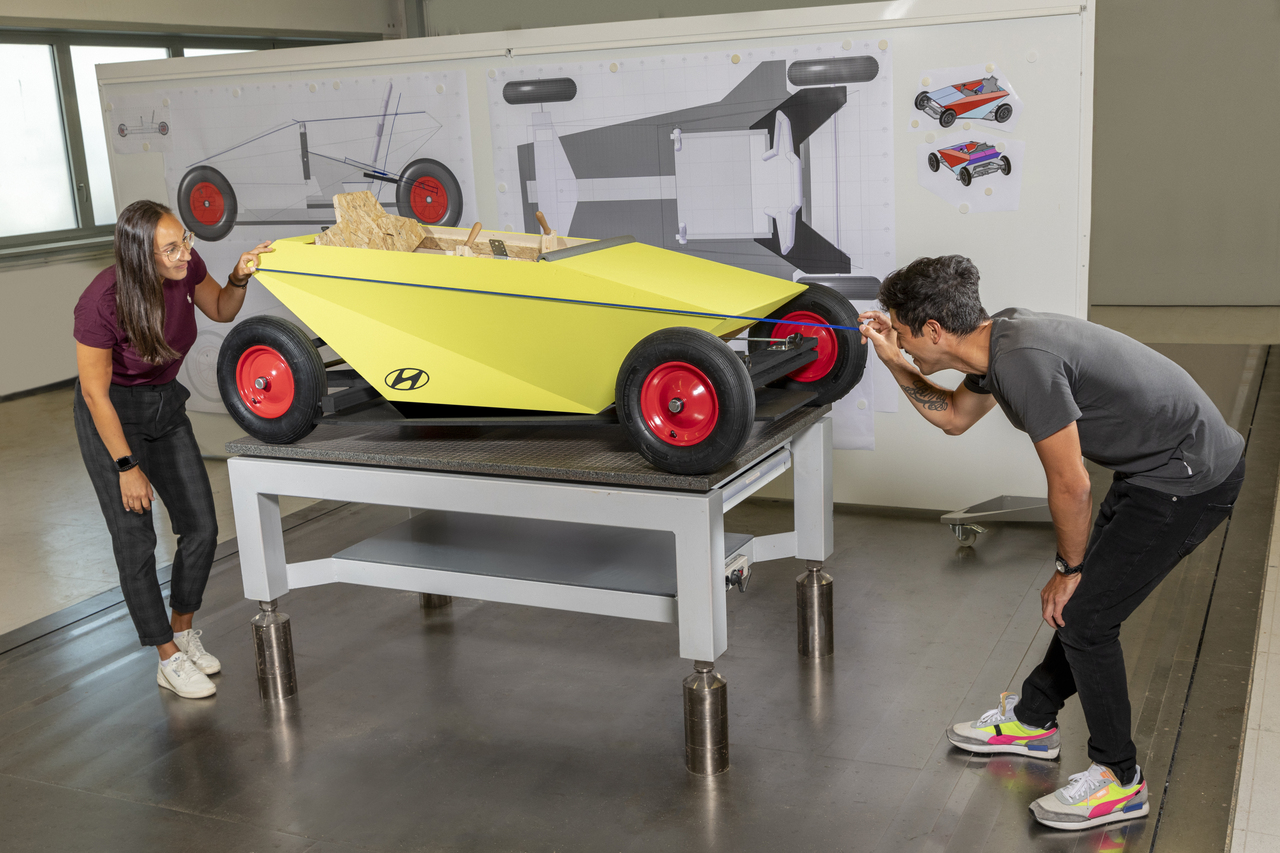 You're looking at the Hyundai soapbox car. And right off the bat, Hyundai's latest creation is unlike any soapbox car you've ever seen. This marvelous creation is the brainchild of the folks at Hyundai Motor Europe Technical Center (HMETC) and is built using ordinary materials like wood, metal rods, brackets, and screws.