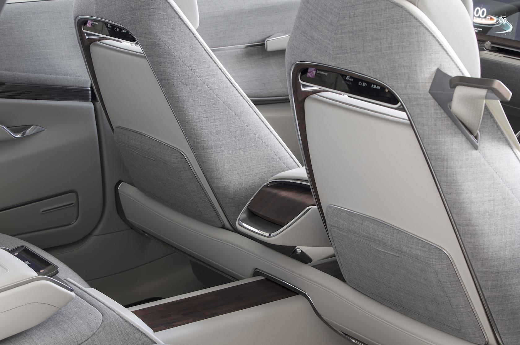 In the back, meanwhile, comfort and relaxation are at the fore. Along with two big, comfortable seats there are slide-out displays built into the headrests, that cleverly collapse until they're just a sliver of touchscreen to handle the essentials of HVAC control, multimedia, and other basics.