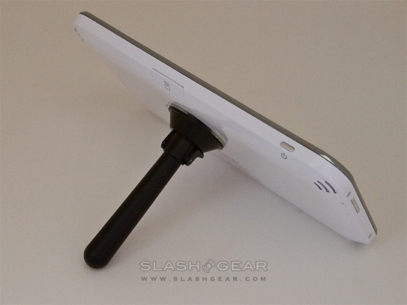 As well as the WebStation itself, Camangi include a power supply, pouch case, wired stereo headset with microphone and a cleaning cloth, together with an unusual desk-stand that uses a suction cup to stick to the back of the tablet. A pull-out stylus lives on the bottom edge.