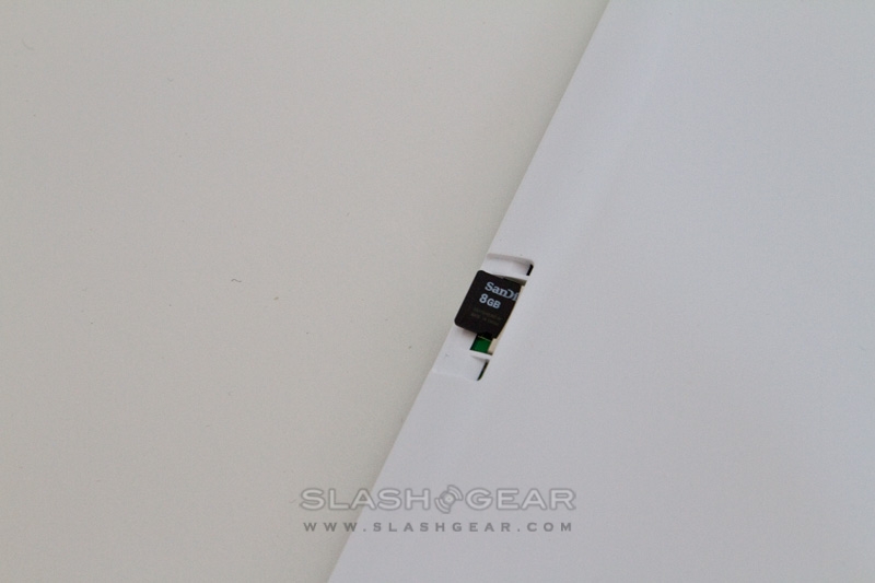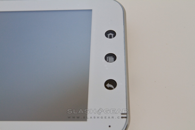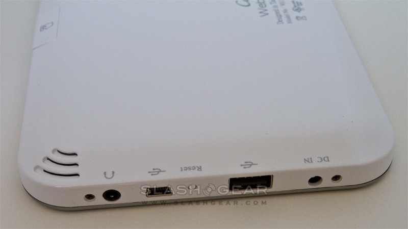 In terms of hardware, the WebStation is a 7.87 x 4.72 x 0.57 inch slate weighing 13.75 oz and dominated by a 7-inch WVGA 800 x 480 resistive touchscreen. Three buttons – Home, Menu and Back – run along the right side of the display bezel, while there are volume controls on the left edge and a power button on the top. Our review unit is white, though Camangi also offer black and pink versions. Connectivity includes a full-sized USB 2.0 port, mini USB, 3.5mm headphone jack and WiFi b/g, together with a microSD slot.