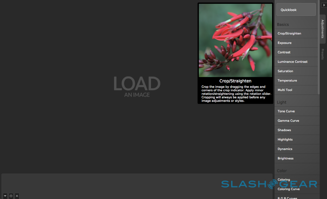 If you need a grander sense of what the adjustments presets might do, a 'Quick Look' button brings up a menu of all the filters and what your pic will look like once they've been applied.