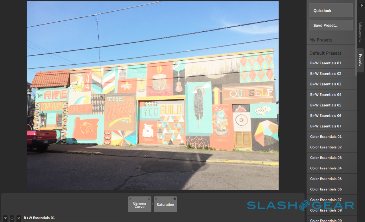 The quick preview when choosing an adjustment or preset is also brilliant. It's just plain awesome for those times you've forgotten just what the temperature tool might do to your photo, or know you need it to look kinda old-school, but forgot the effect you were looking for is called vignette. The larger format of the preview adds to the speed in which you can cycle through pics.