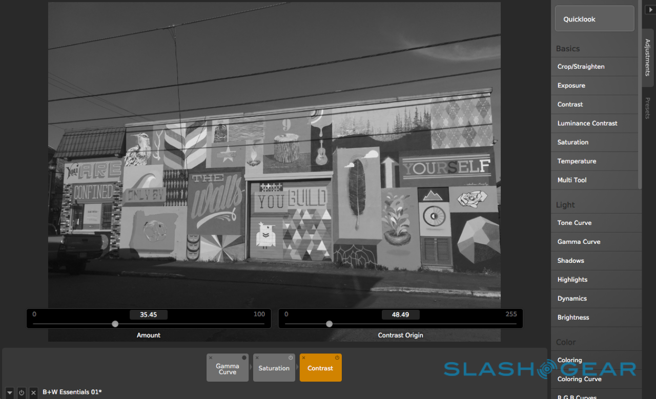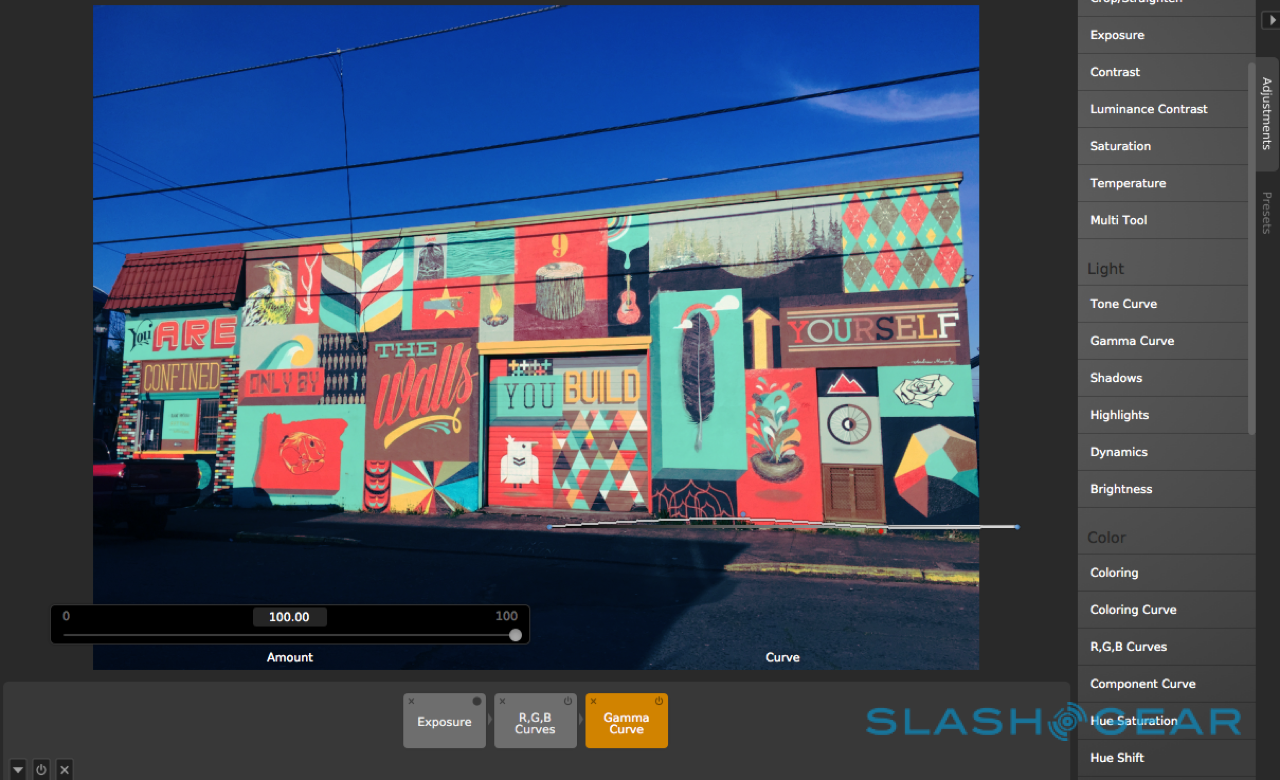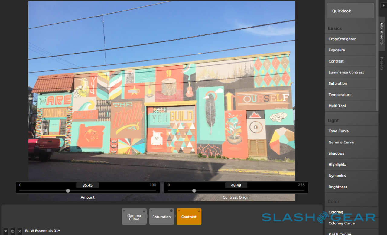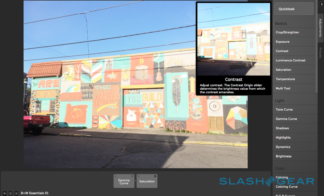 That's not it, though. Even after you choose a preset, the individual components that make up that preset are found as building blocks under the pic. You can toggle each on or off, and even dismiss them entirely. Once applied, you can also choose the opacity or strength of the adjustment or preset.