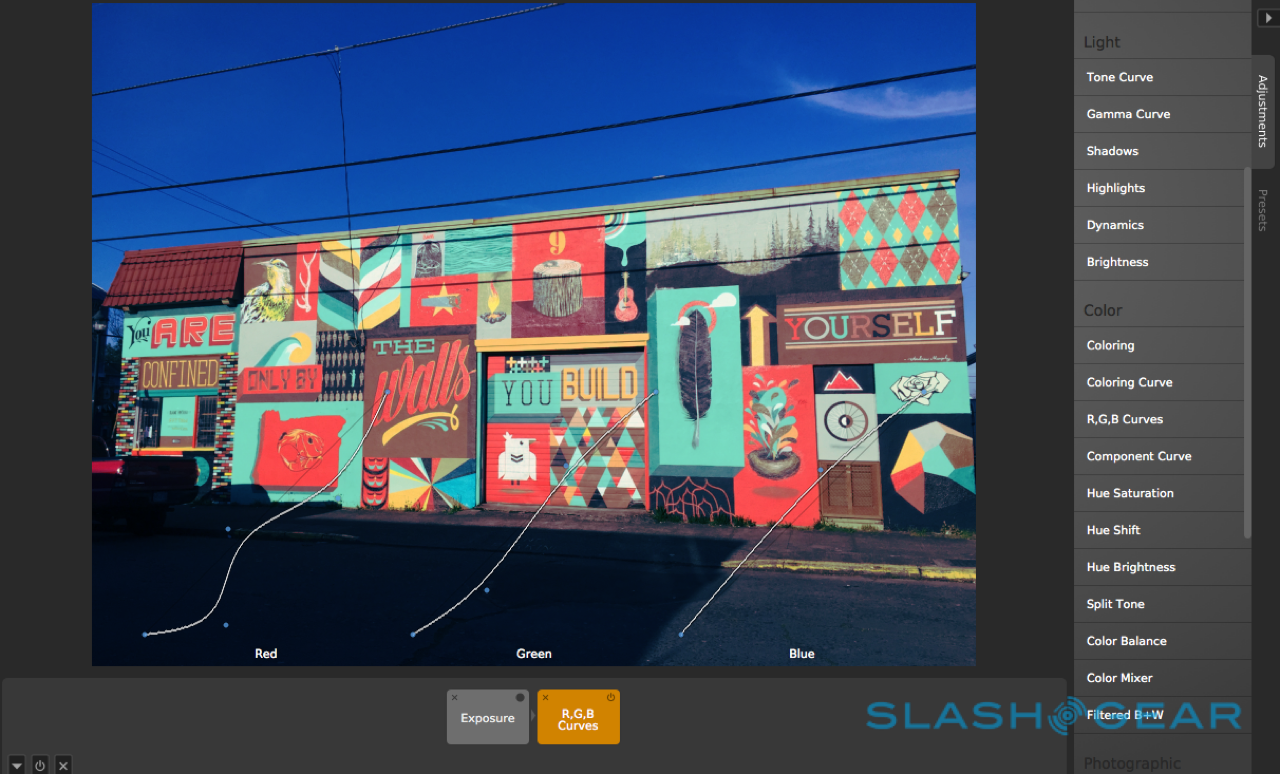 It's subtle things that make CameraBag 2 stand out, though. The building blocks (I'm not sure what the CameraBag 2 team refers to them as, so I'm calling them blocks) at the bottom of a pic are just outstanding. In addition to being able to dismiss or toggle them on or off, clicking each allow you to fine tune them. Did gamma mess with your red balance? Not even a problem; nor do you have to remember where in a menu or settings the RGB curves are. It's all under your picture, ready for manipulation.