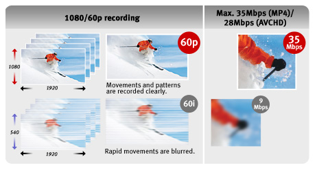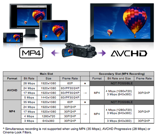 With this camera's new Dual Recording feature you'll be able to grab both 1080/60p MP4 (35Mbps) and AVCHD Progressive (28 Mbps). You'll also find cinematic recording at Native 24p, a set of two SD memory card slots (amazing!) and Relay Recording. With Relay Recording your recording will instantly start on one SD card after the first has been filled – greatness!