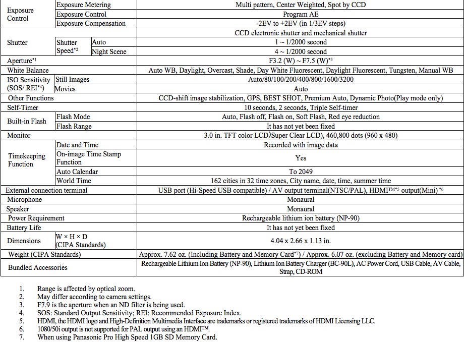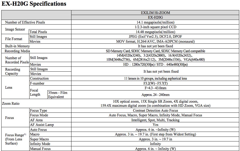 Equipped with the new EXILIM Engine HS, the EX-H20G features all of the essential capabilities expected from a camera. When used with Casio's Single Frame SR Zoom function, the 24mm wide-angle, 10x optical zoom lens actually offers a 15x zoom range that maintains the image quality needed for 14.1-megapixel high-resolution photography. This represents 1.5 times the range of the optical zoom, with virtually no loss in quality. Other features include 720p HD video recording (30fps), as well as a three-inch, high-resolution 460K super clear LCD that is easy to view even when outdoors. The EX-H20G also comes with Casio's advanced, fully automatic Premium Auto function for taking beautiful shots of scenery and people with just a press of the shutter button, and various useful functions for traveling such as Panorama Photo mode, which can take 360-degree photos, as well as auto-time adjustment which will automatically synchronize the camera's date and time with that of the user's current location and time zone.