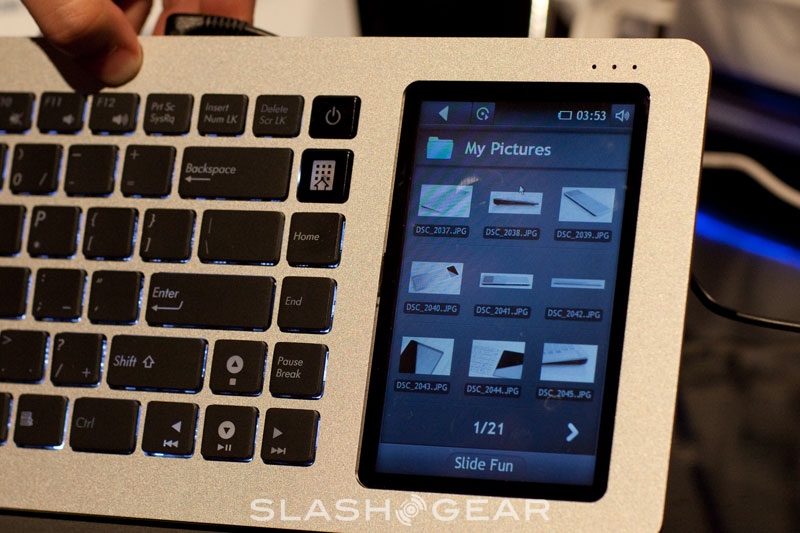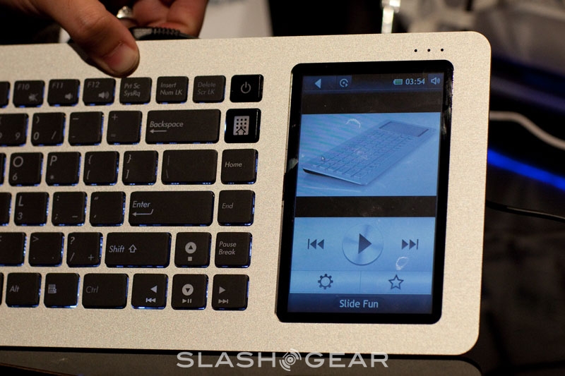 Of all the new products ASUS announced at CES today, the Eee Keyboard is one of the most interesting. A full computer built into a QWERTY keyboard, as well as Ultrawideband HDMI and WiFi b/g/n, it also has a 5-inch touchscreen for shortcuts, media browsing and use as a virtual mouse. While just a prototype at the moment, ASUS were cagey about its potential for market availability; SlashGear spent some more close-up time to see exactly what that touch-display can do.