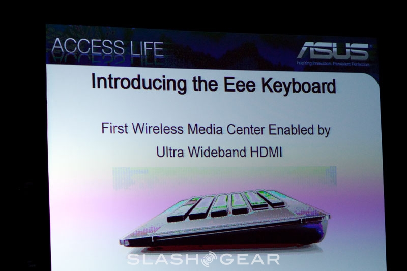 This is one of those products that we'd really love to see come to market. All-in-one computers integrated into keyboards aren't new, but they don't tend to look as slick as this Eee concept; that's likely thanks to the smaller Atom platform. The addition of Ultrawideband HDMI, too, should answer one of the big usability issues with HDTV-connected devices: having to reach around the back of the set to unplug it.