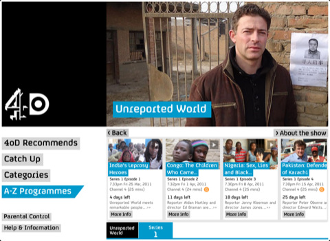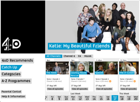 UK broadcaster Channel 4 has released a 4oD Catch Up app [iTunes link] for the iPad, offering access to content shown on Channel 4, E4 and More4 from the past thirty days. Like the BBC iPlayer app, it streams content previously shown on broadcast television.
